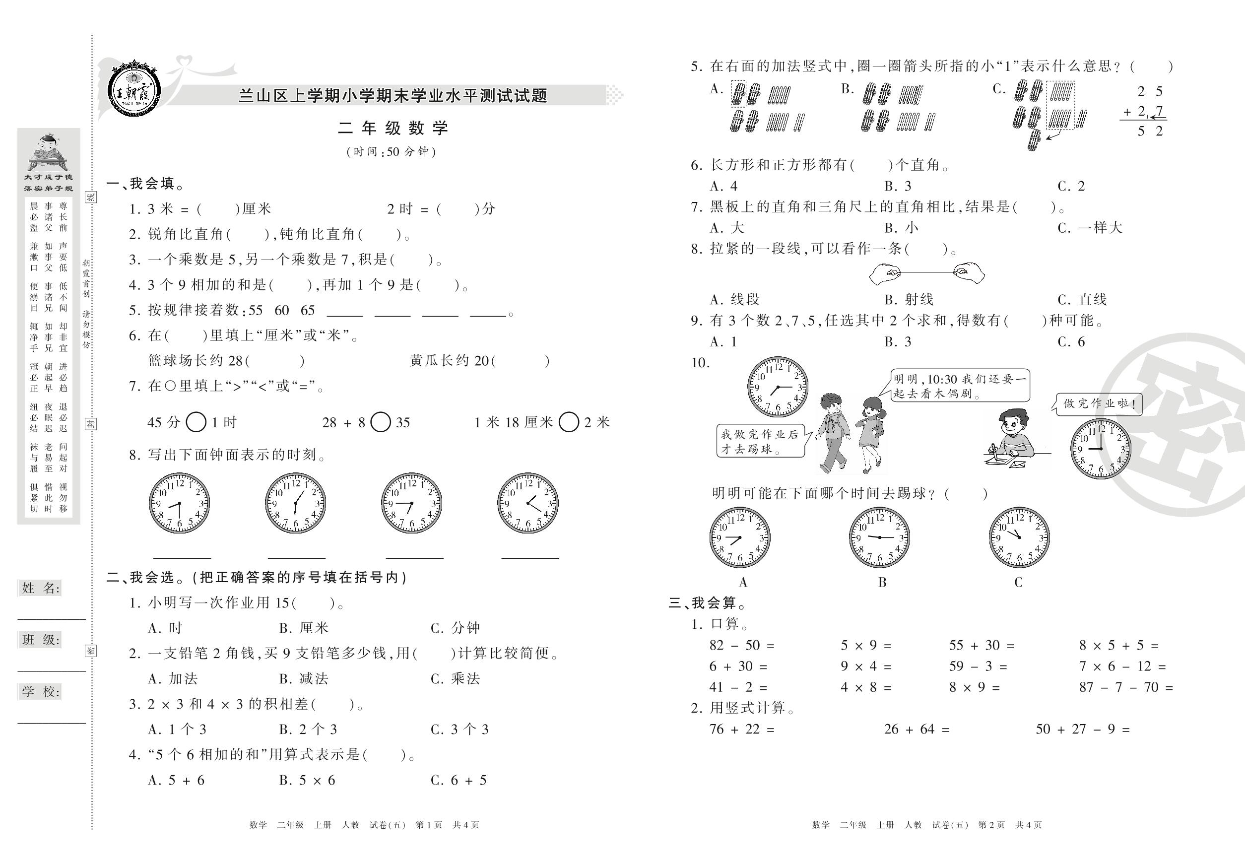 2016-2017学年第一学期临沂市兰山区二年级数学试卷(人教版)【5】