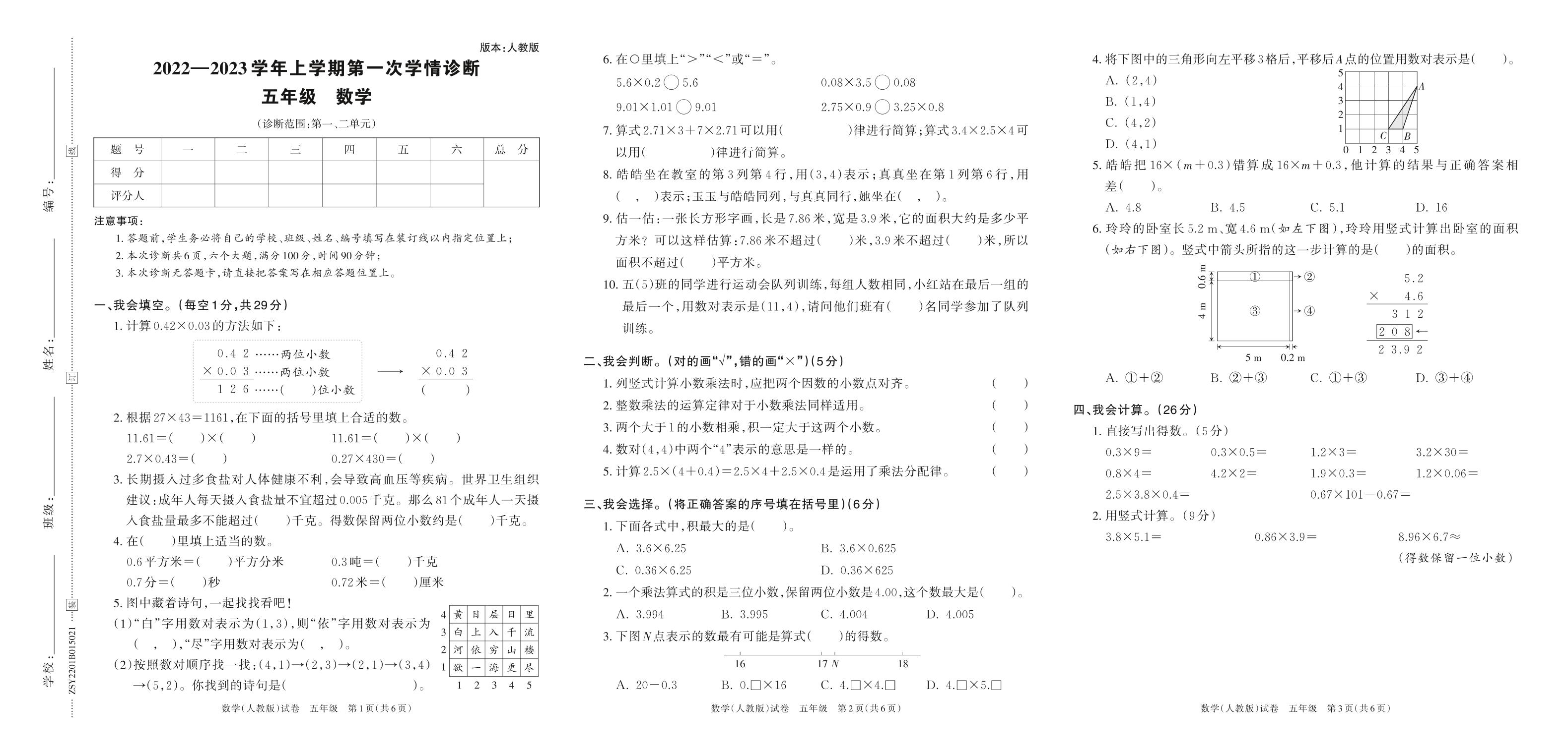 河南省周口市西华县第二实验小学2022—2023学年上学期第一次学情诊断试卷五年级数学(人教版)