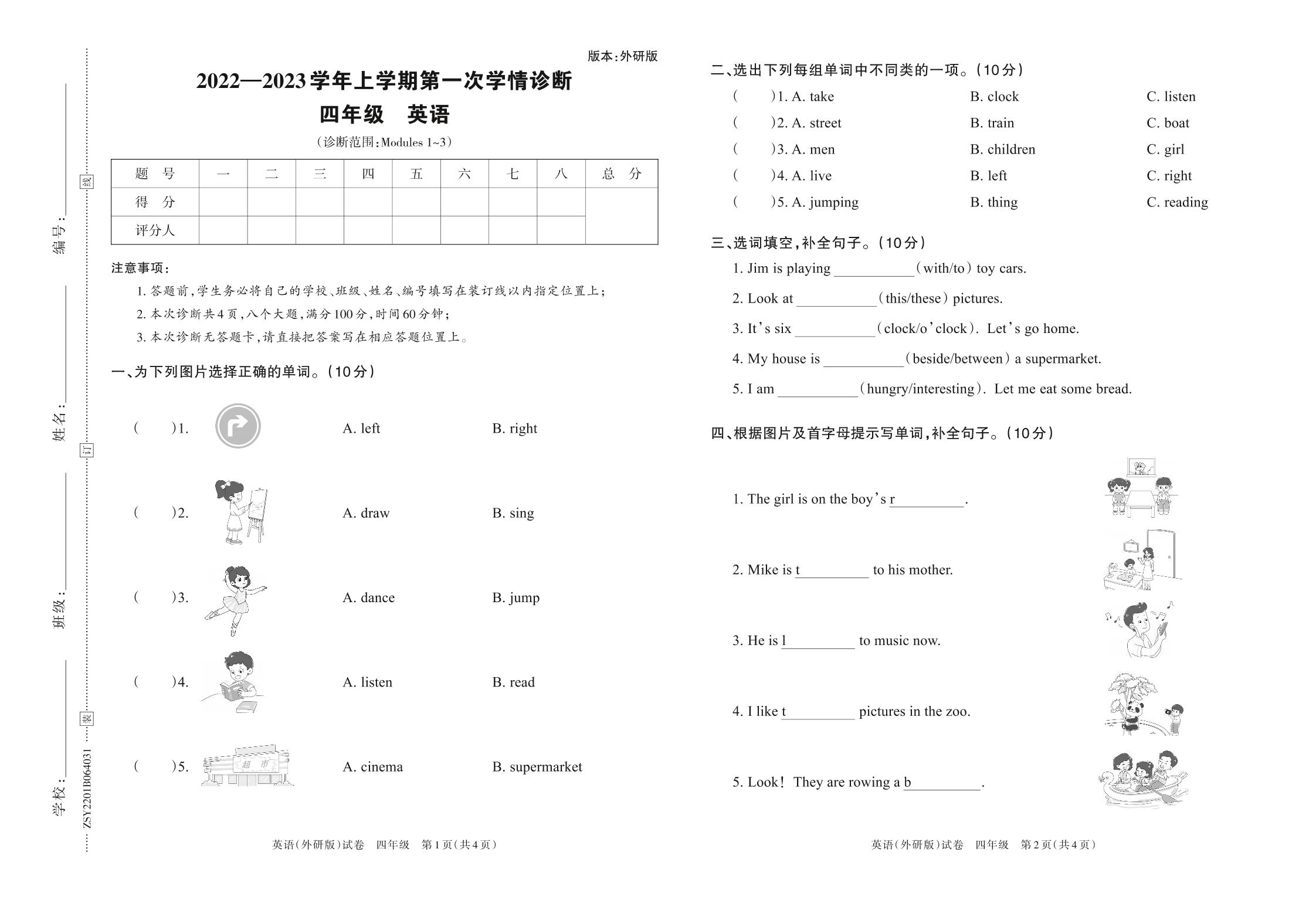 河南省漯河市舞阳县第二实验小学2022—2023学年上学期第一次学情诊断试卷四年级英语(外研版)