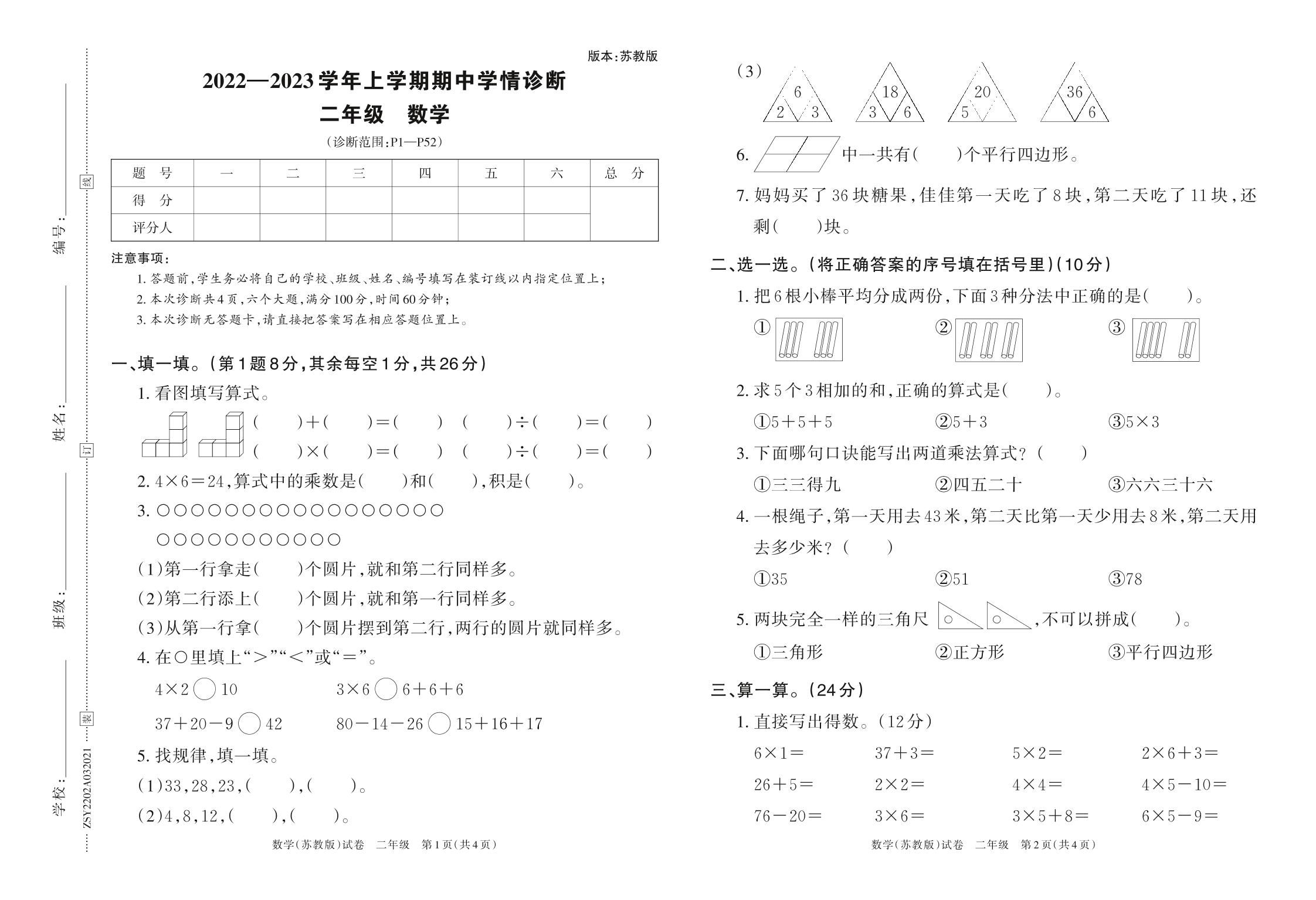 河南省洛阳市嵩县2022—2023学年上学期第二次学情诊断(期中)试卷二年级数学(苏教版)