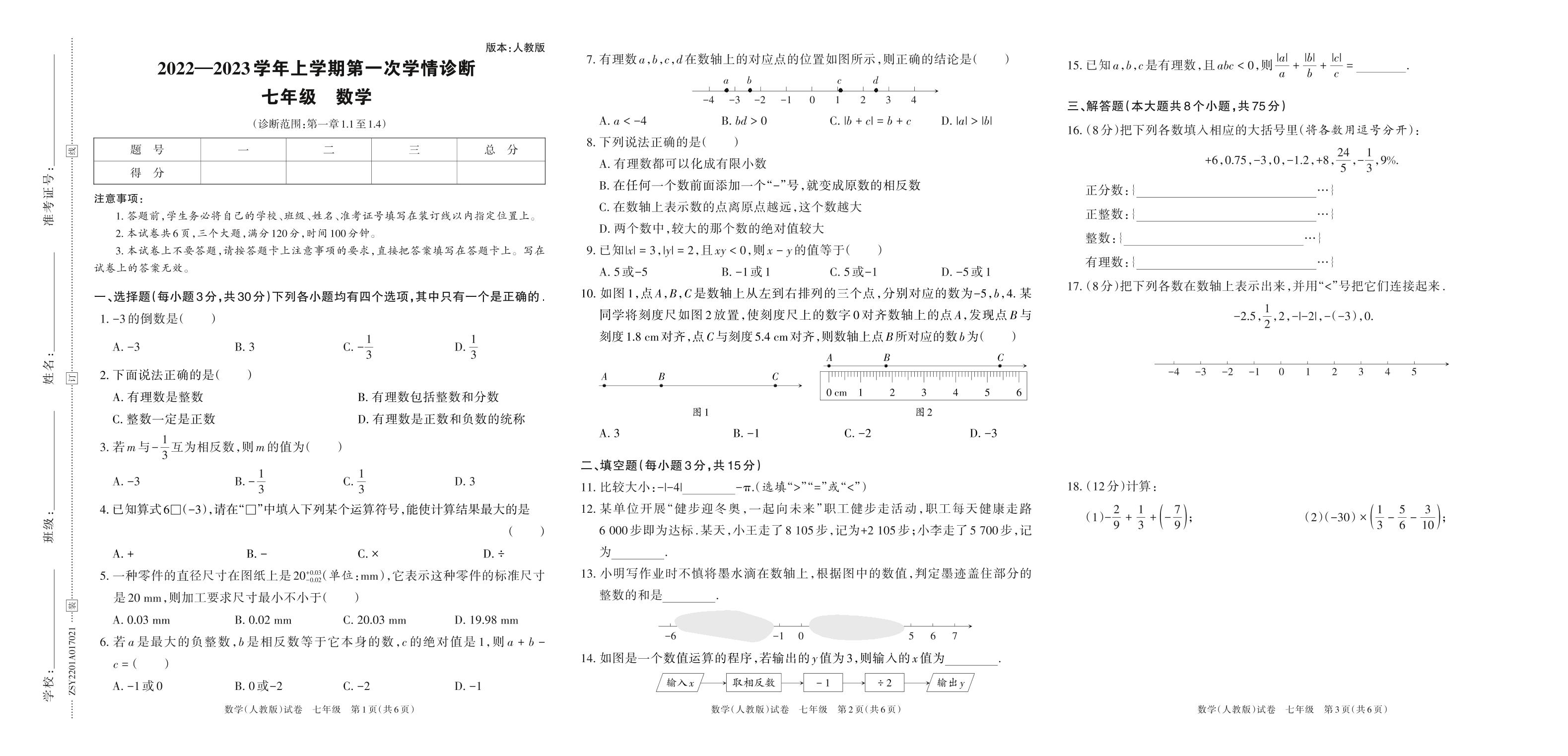河南省安阳市林州红旗渠大道中学2022—2023学年上学期第一次学情诊断试卷七年级数学(人教版)