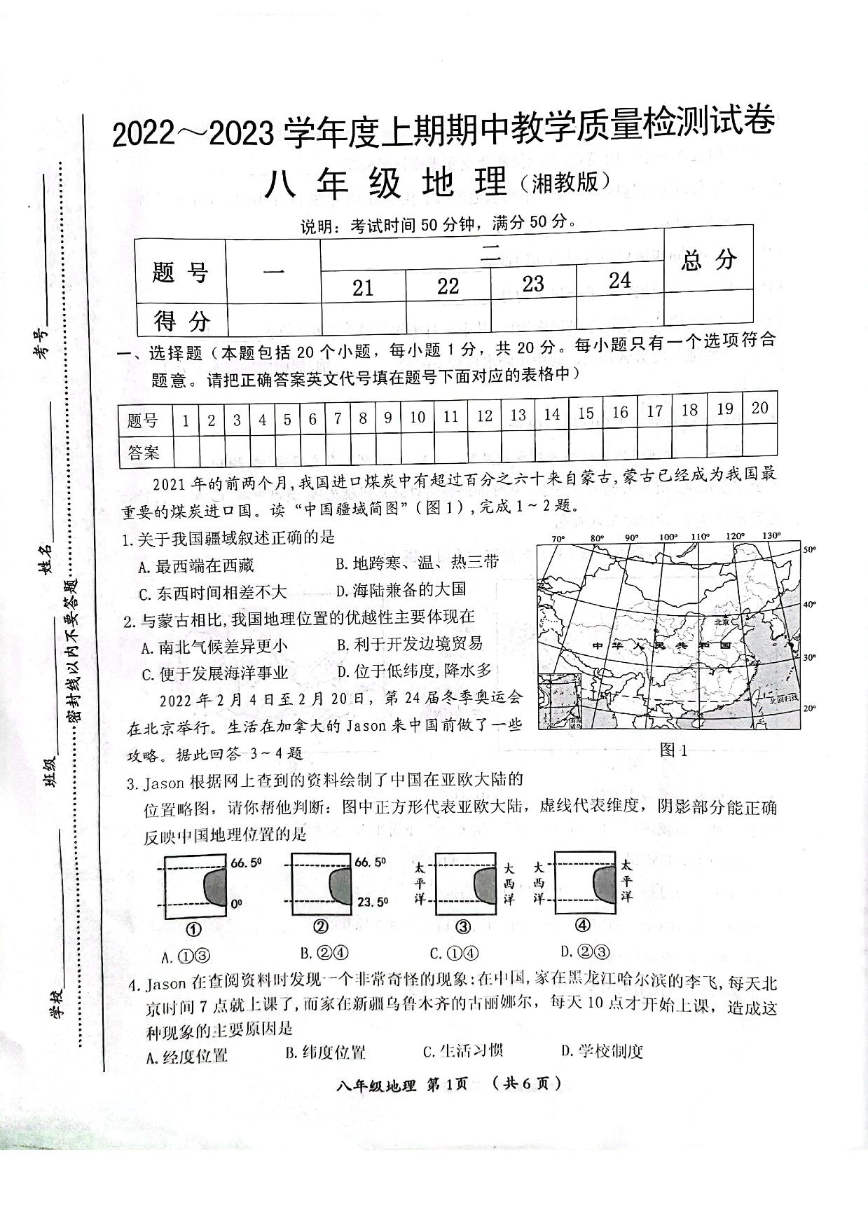 八年级地理湘教版上册期中卷