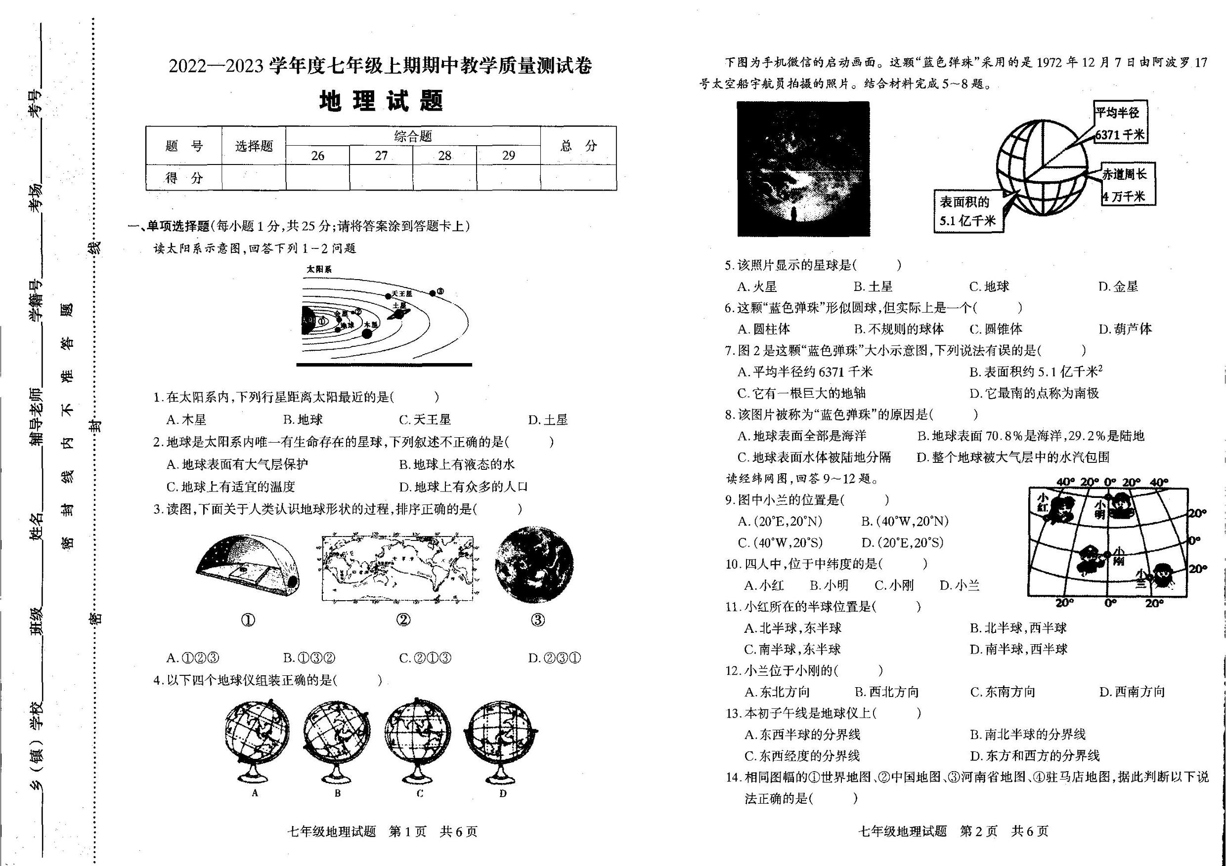 河南省驻马店市上蔡县2022-2023学年第一学期期中试题七年级地理(人教版)
