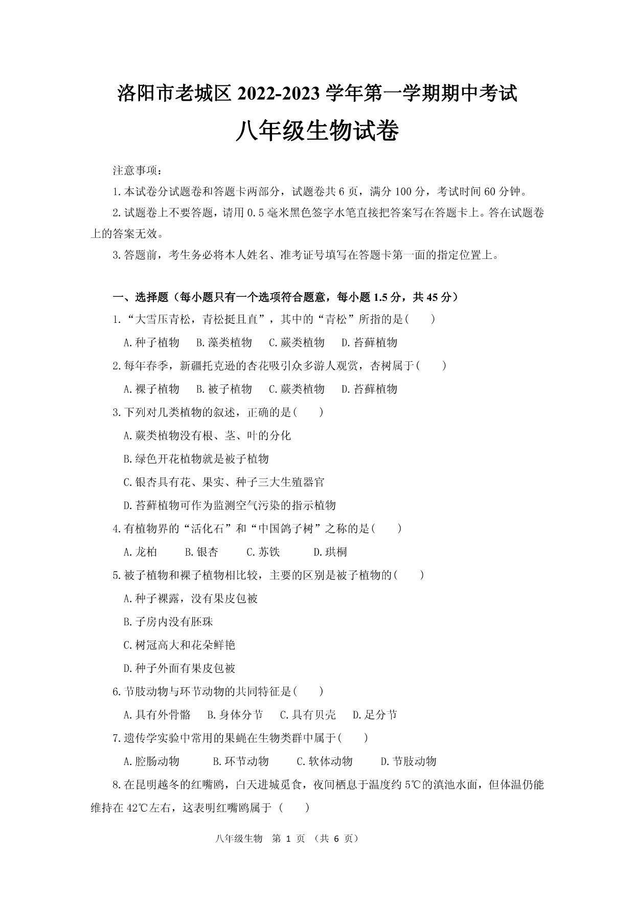 河南省洛阳市老城区2022-2023学年第一学期期中考试试卷八年级生物(苏教版)