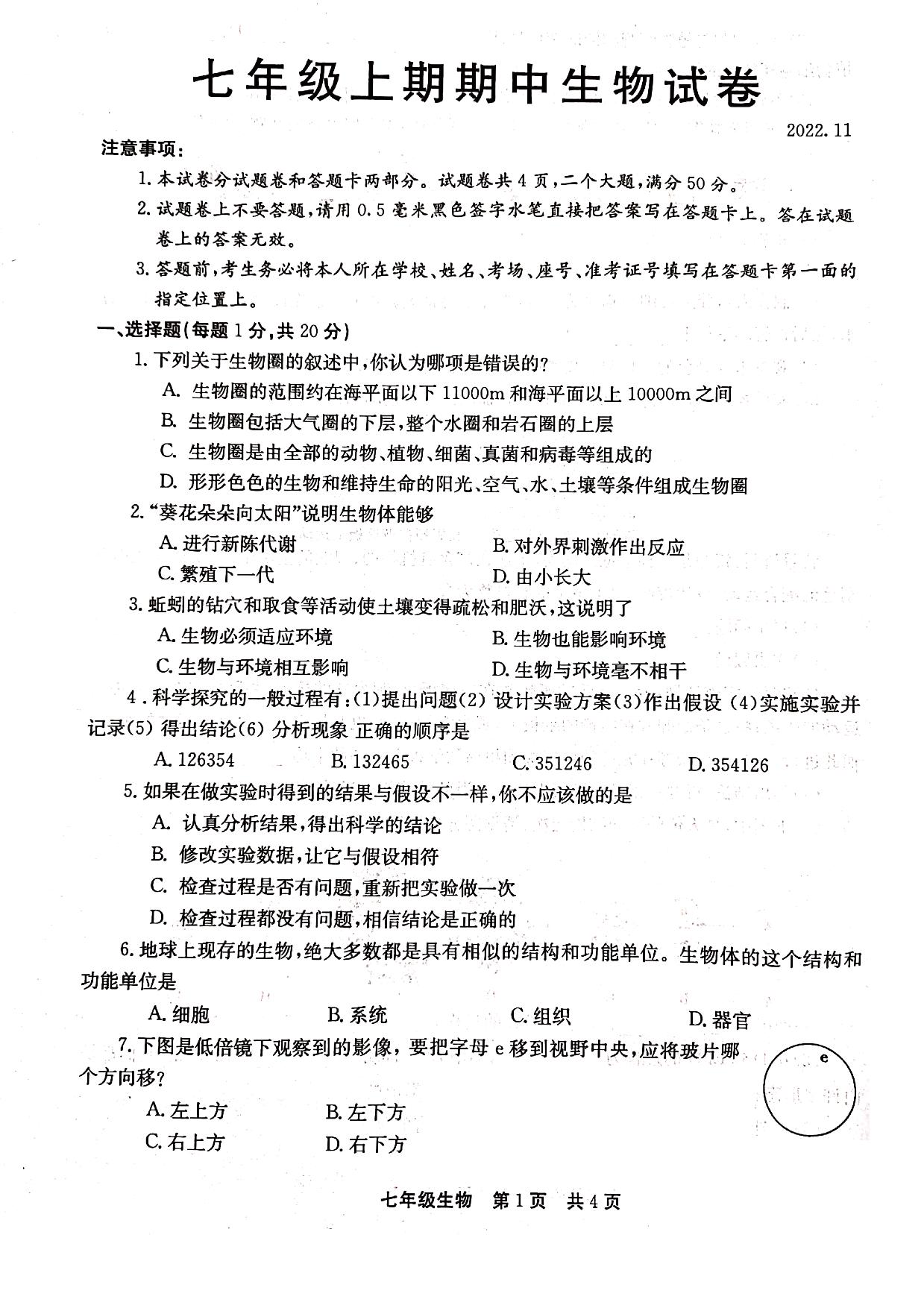 七年级生物北师版上册期中卷