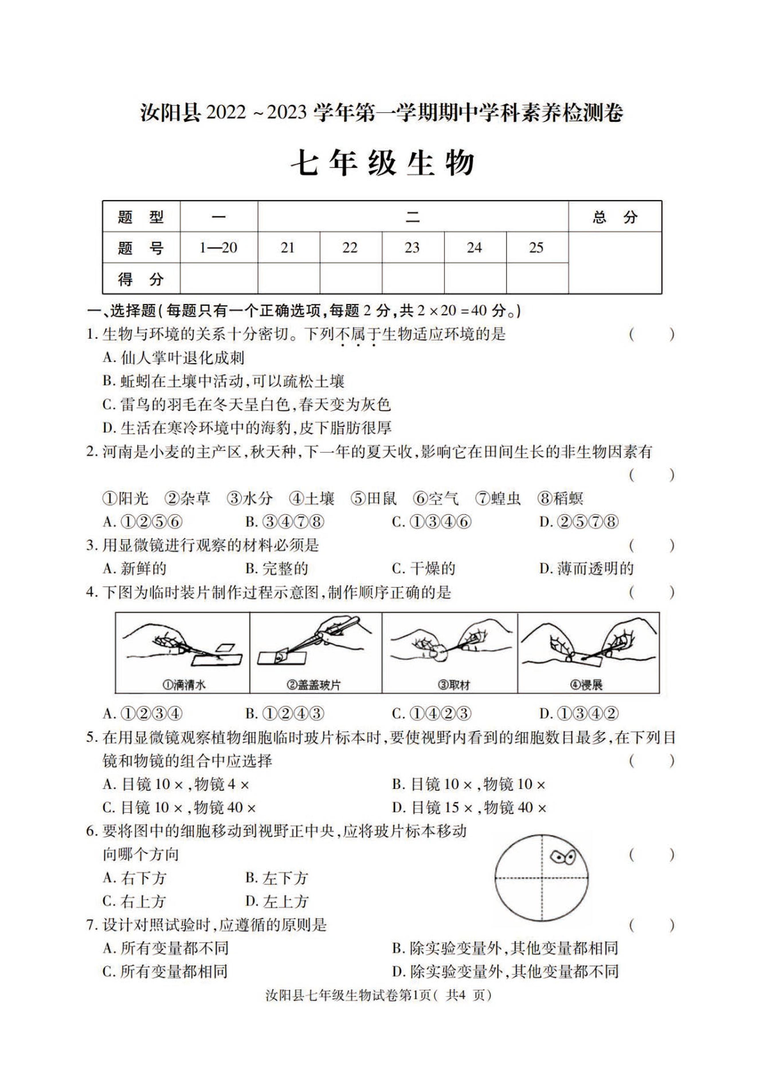 河南省洛阳市汝阳县2022-2023学年第一学期期中考试试卷八年级生物(苏教版)