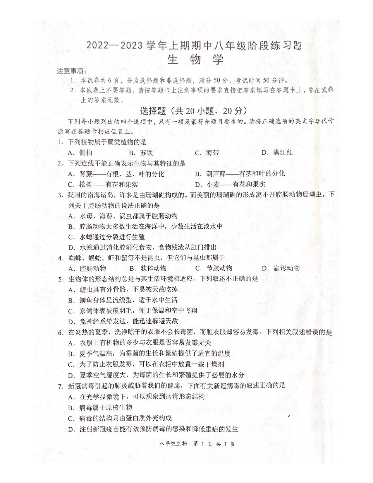 八年级生物苏教版上册期中卷