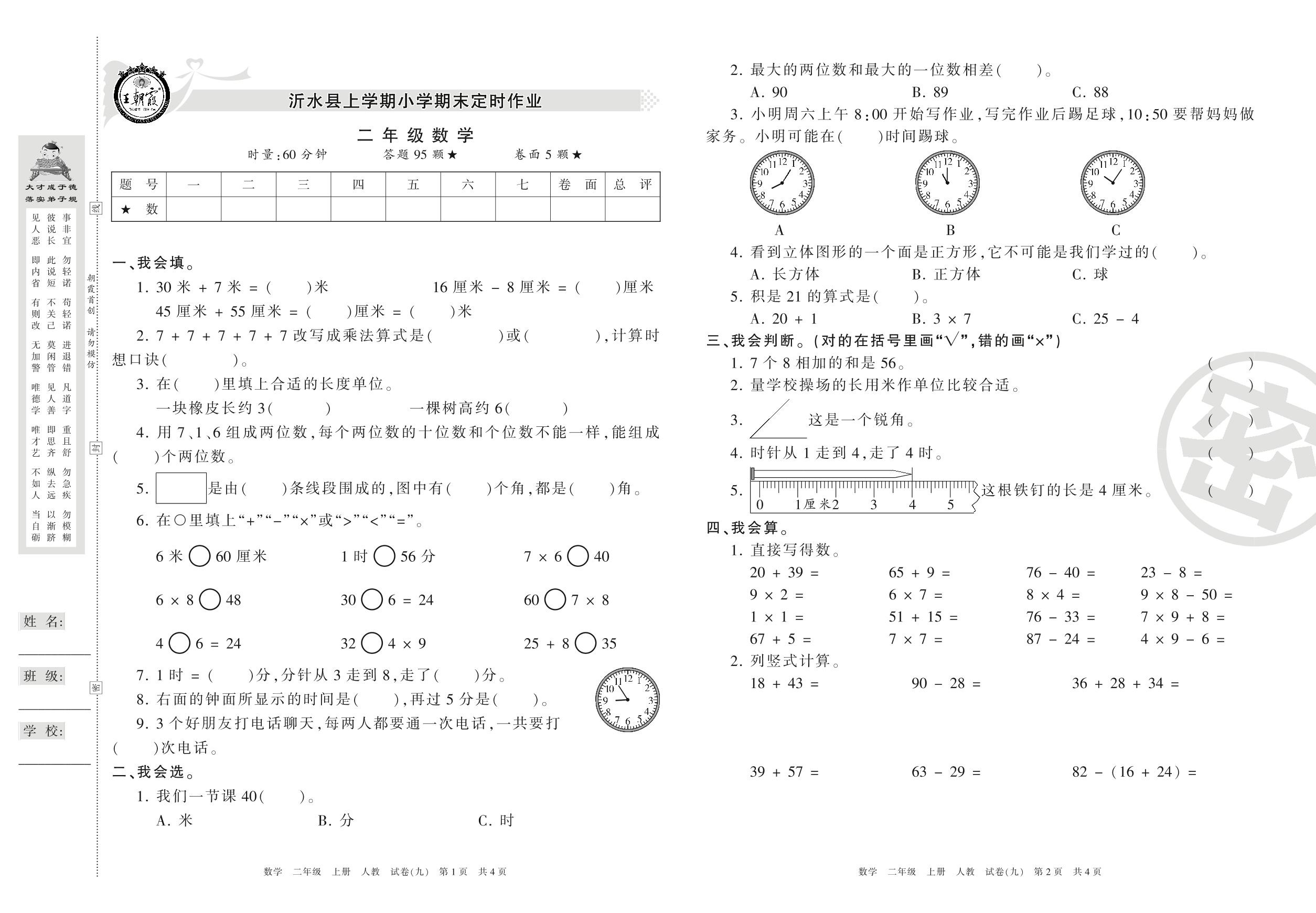 2016-2017学年第一学期临沂市沂水县二年级数学试卷(人教版)【9】