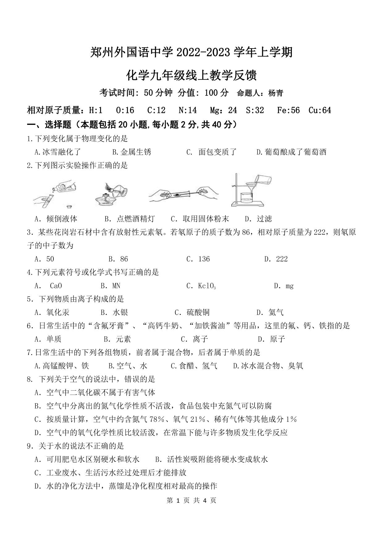 河南省郑州市外国语中学2022-2023学年第一学期线上教学反馈试卷九年级化学(人教版)