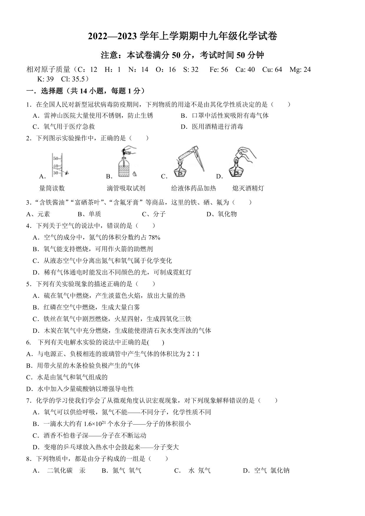 河南省郑州市树人外国语中学2022-2023学年第一学期期中考试试卷九年级化学(人教版)