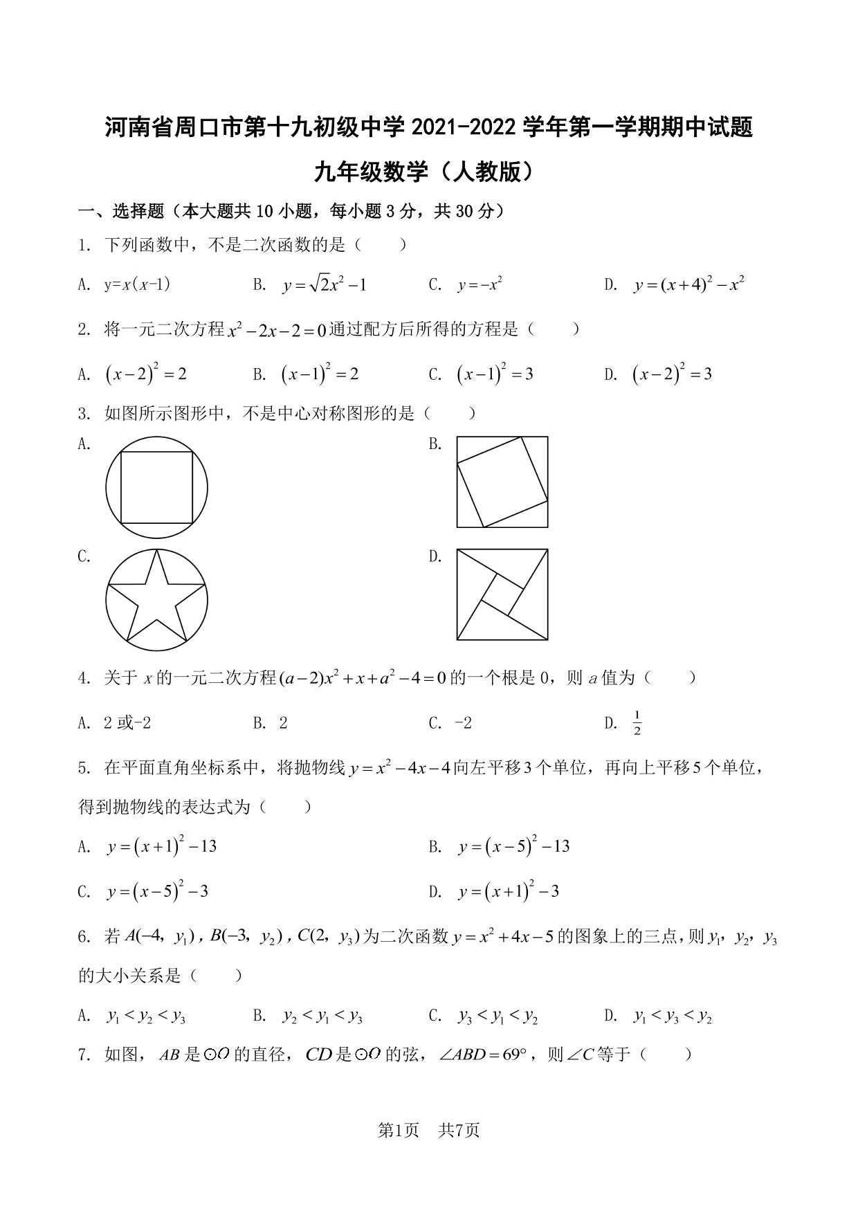 河南省周口市第十九初级中学2021-2022学年第一学期期中试题九年级数学(人教版)