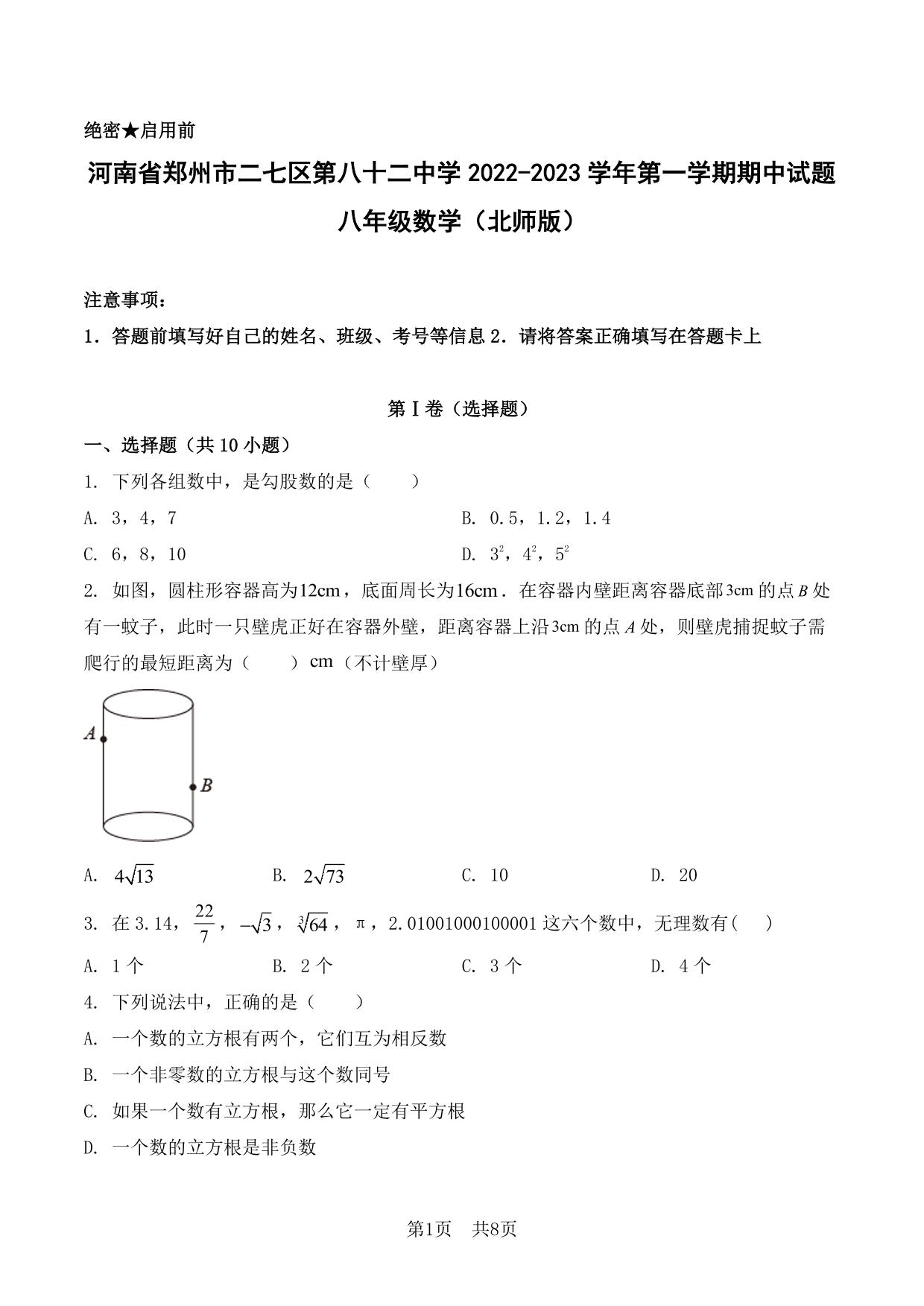 河南省郑州市二七区第八十二中学2022-2023学年第一学期期中试题八年级数学(北师版)