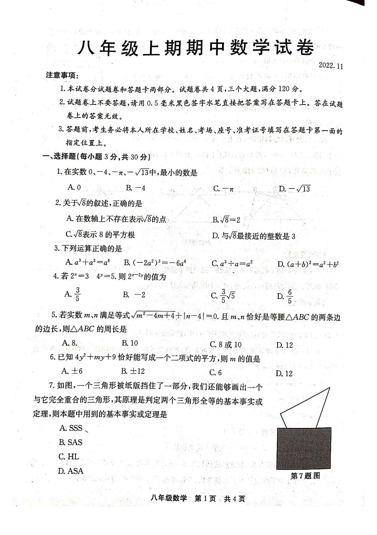 河南省新乡市辉县市2022-2023学年第一学期11月期中考试试题八年级数学(华师版)