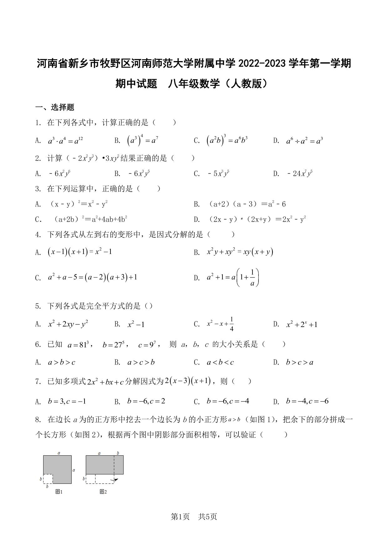 河南省新乡市牧野区河南师范大学附属中学2022-2023学年第一学期期中试题八年级数学(人教版)