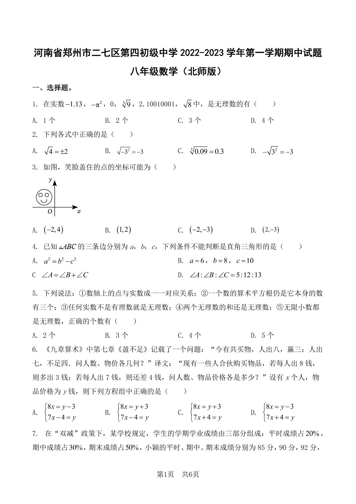 河南省郑州市二七区第四初级中学2022-2023学年第一学期期中试题八年级数学(北师版)