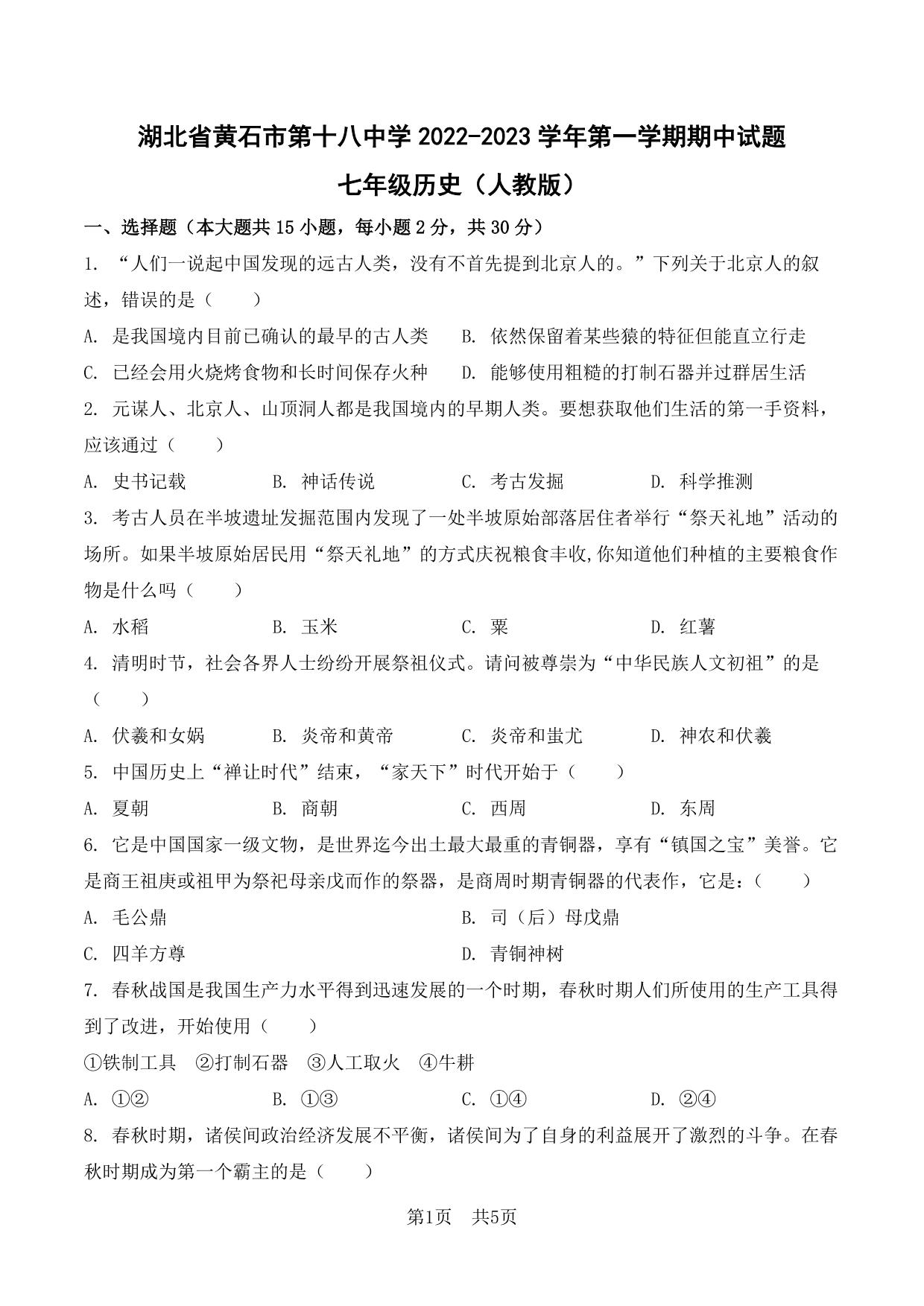 湖北省黄石市第十八中学2022-2023学年第一学期期中试题七年级历史(人教版)