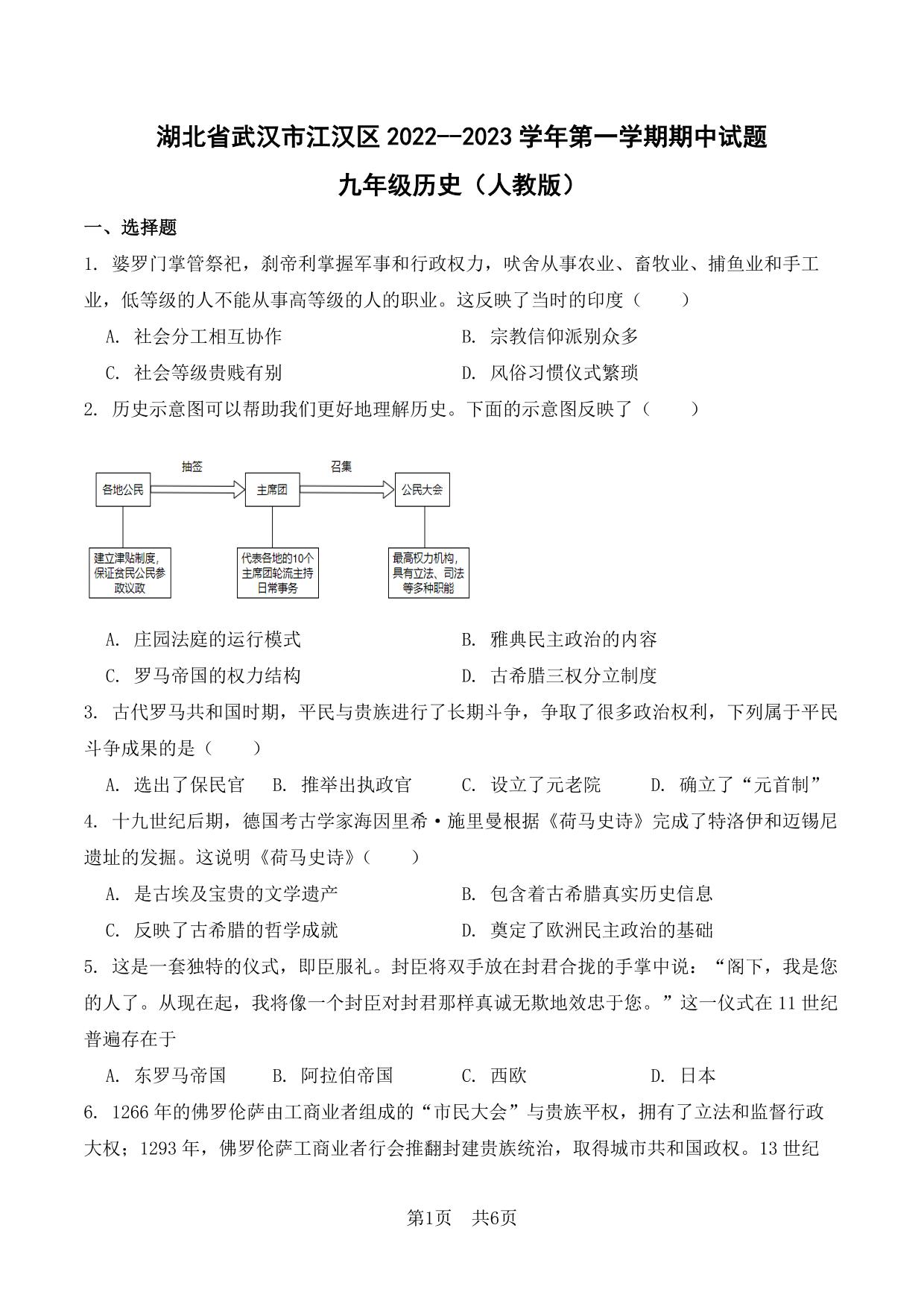 湖北省武汉市江汉区2022--2023学年第一学期期中试题九年级历史(人教版)