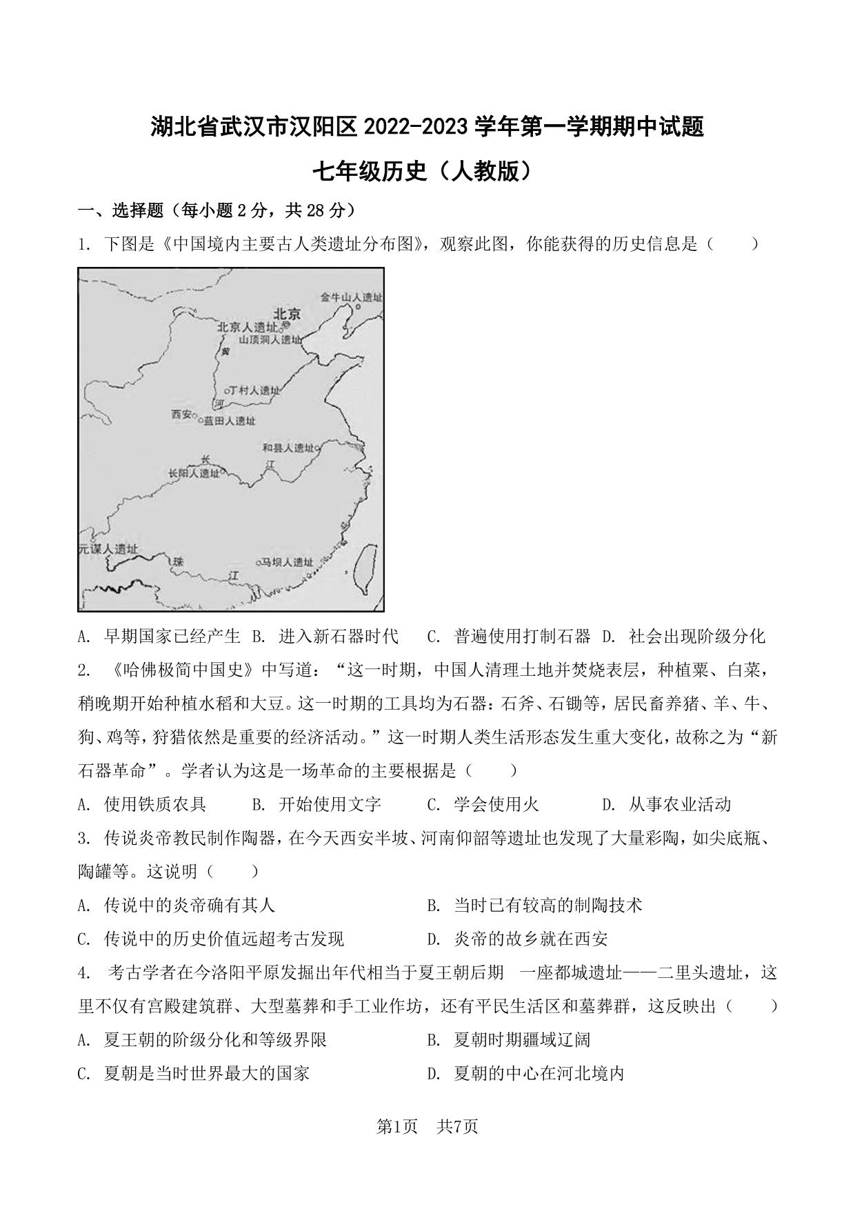 湖北省武汉市汉阳区2022-2023学年第一学期期中试题七年级历史(人教版)