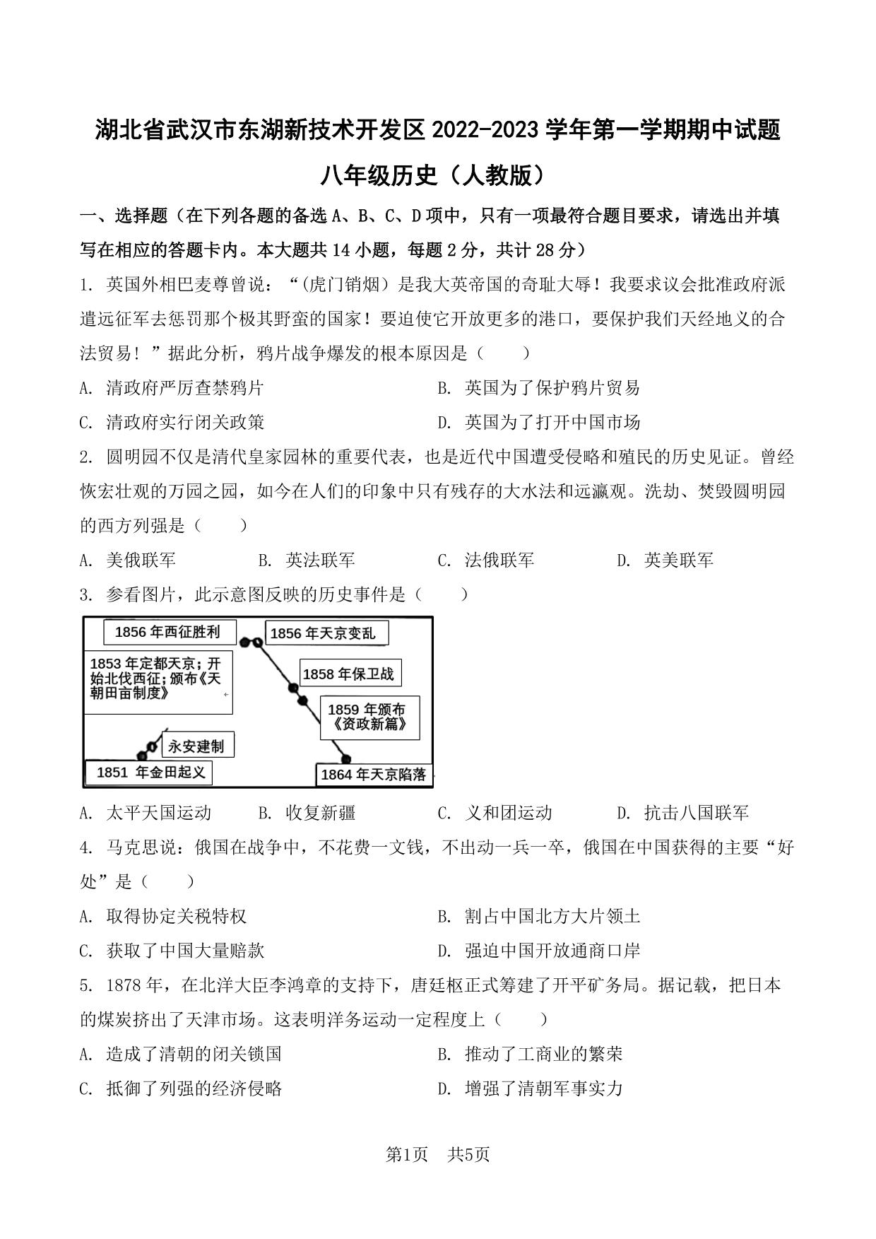 湖北省武汉市东湖新技术开发区2022-2023学年第一学期期中试题八年级历史(人教版)