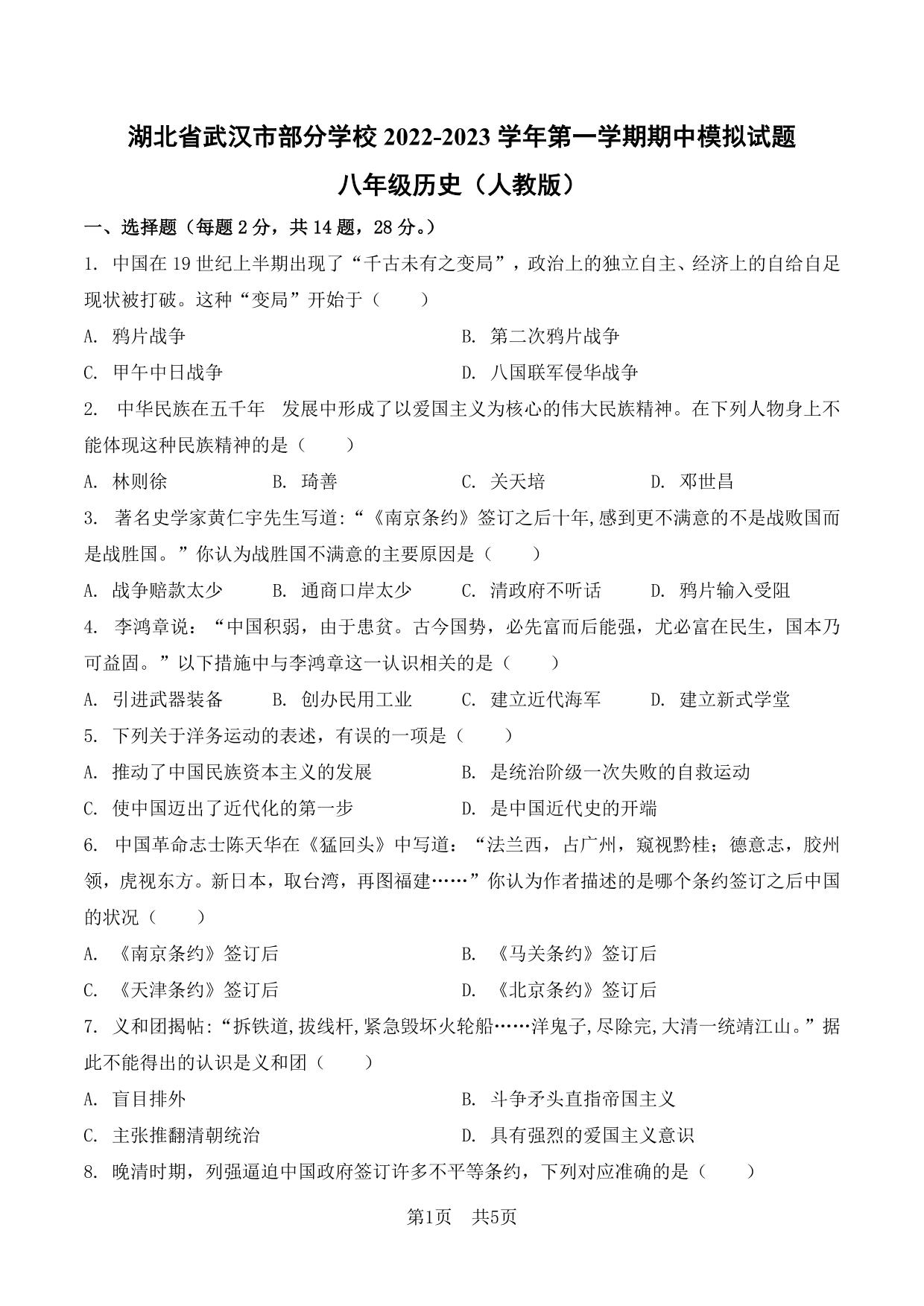 湖北省武汉市部分学校2022-2023学年第一学期期中模拟试题八年级历史(人教版)