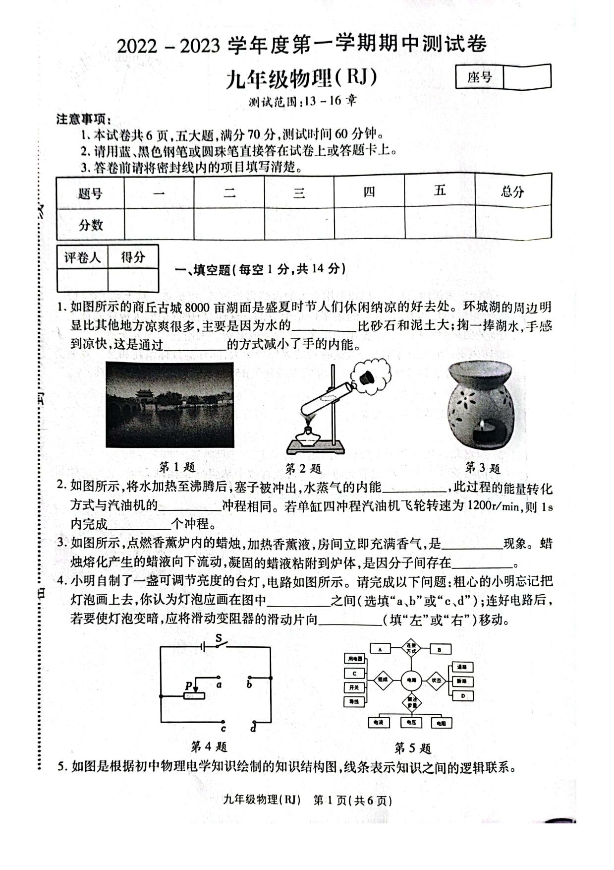 河南省驻马店市正阳县2022-2023学年第一学期期中考试试题九年级物理(人教版)