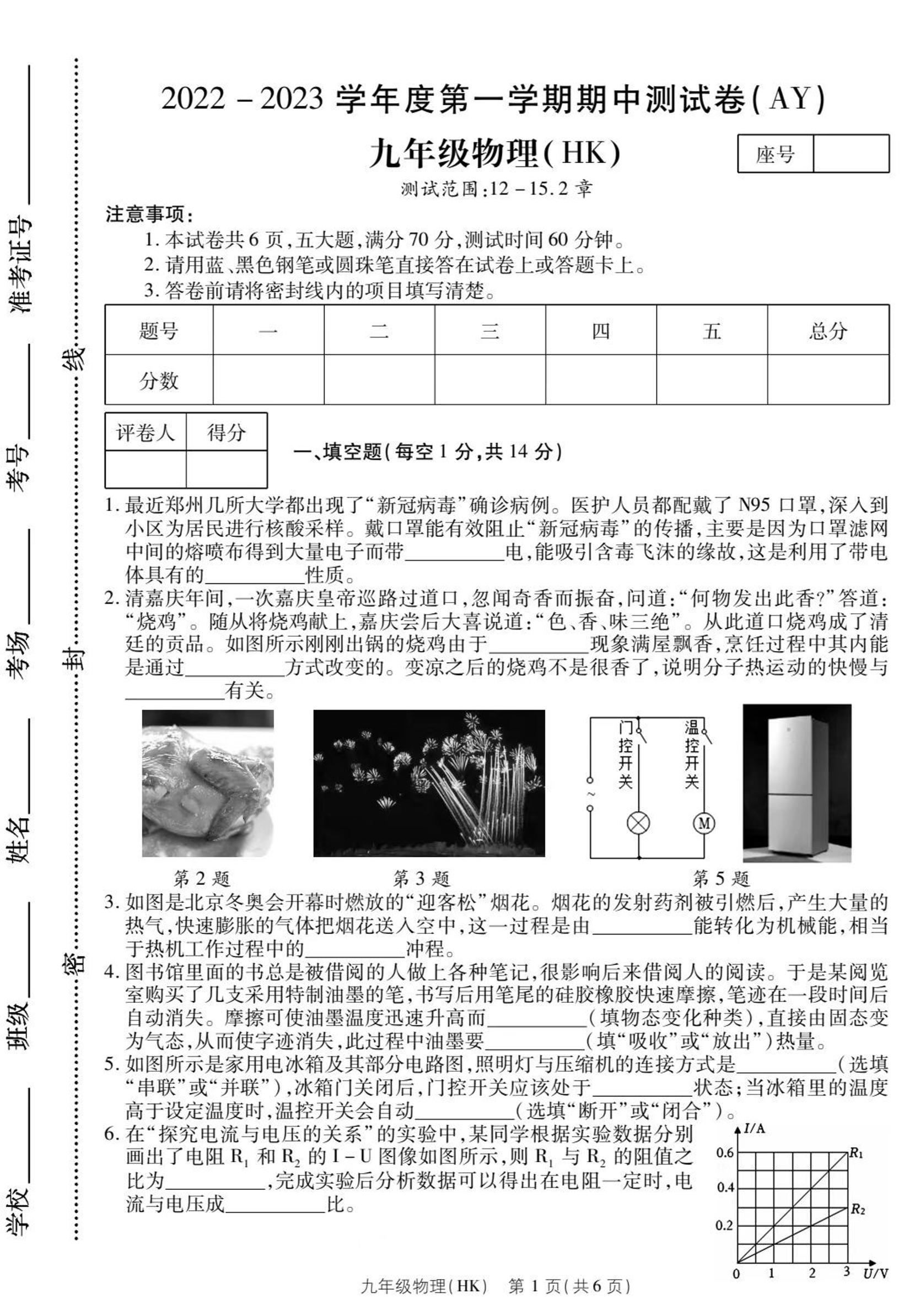 河南省安阳市五校联考2022-2023学年第一学期期中试卷九年级物理(沪科版)