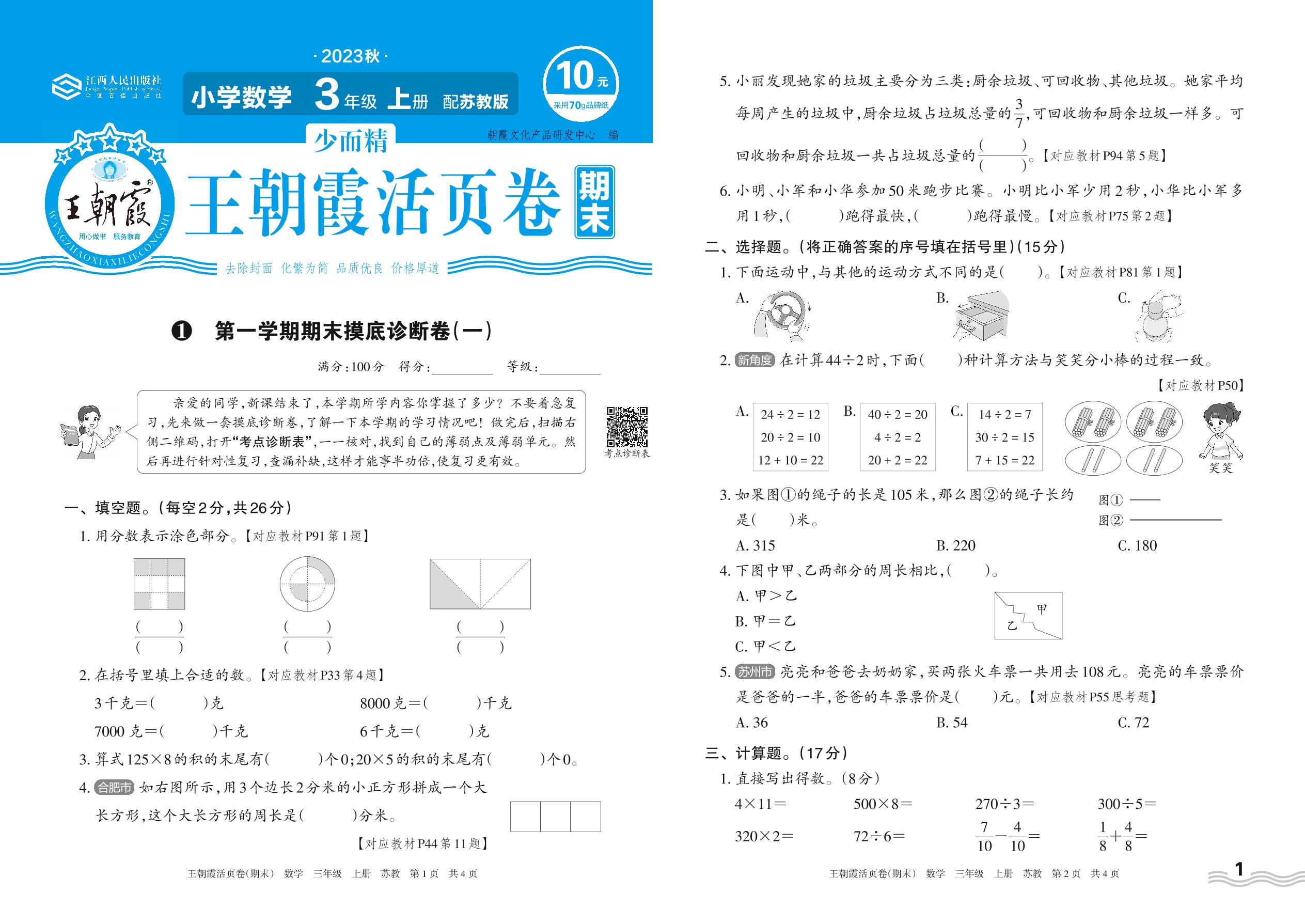 2023上册三年级数学苏教版 1 第一学期期末摸底诊断卷(一)