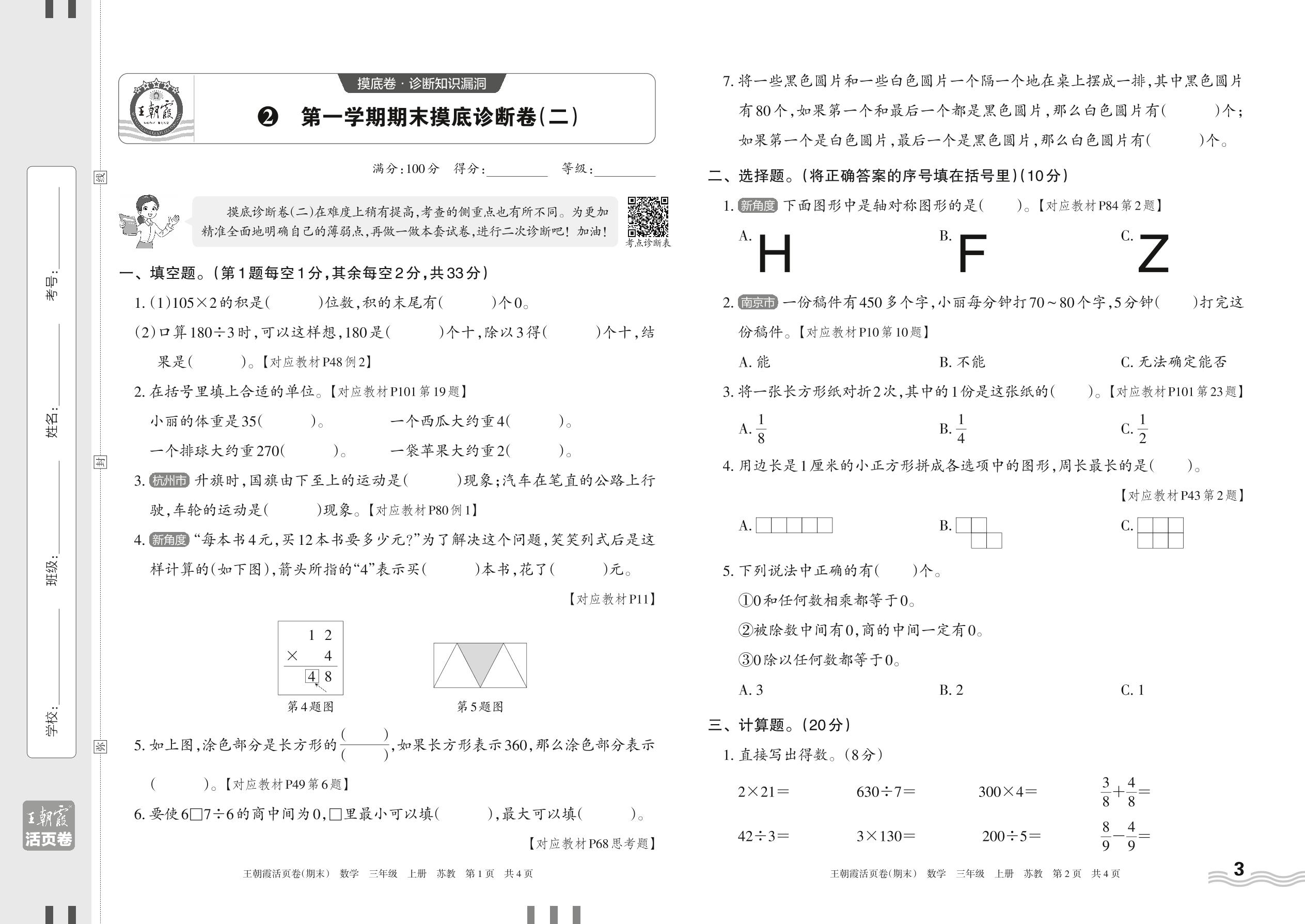 2023上册三年级数学苏教版 2 第一学期期末摸底诊断卷(二)