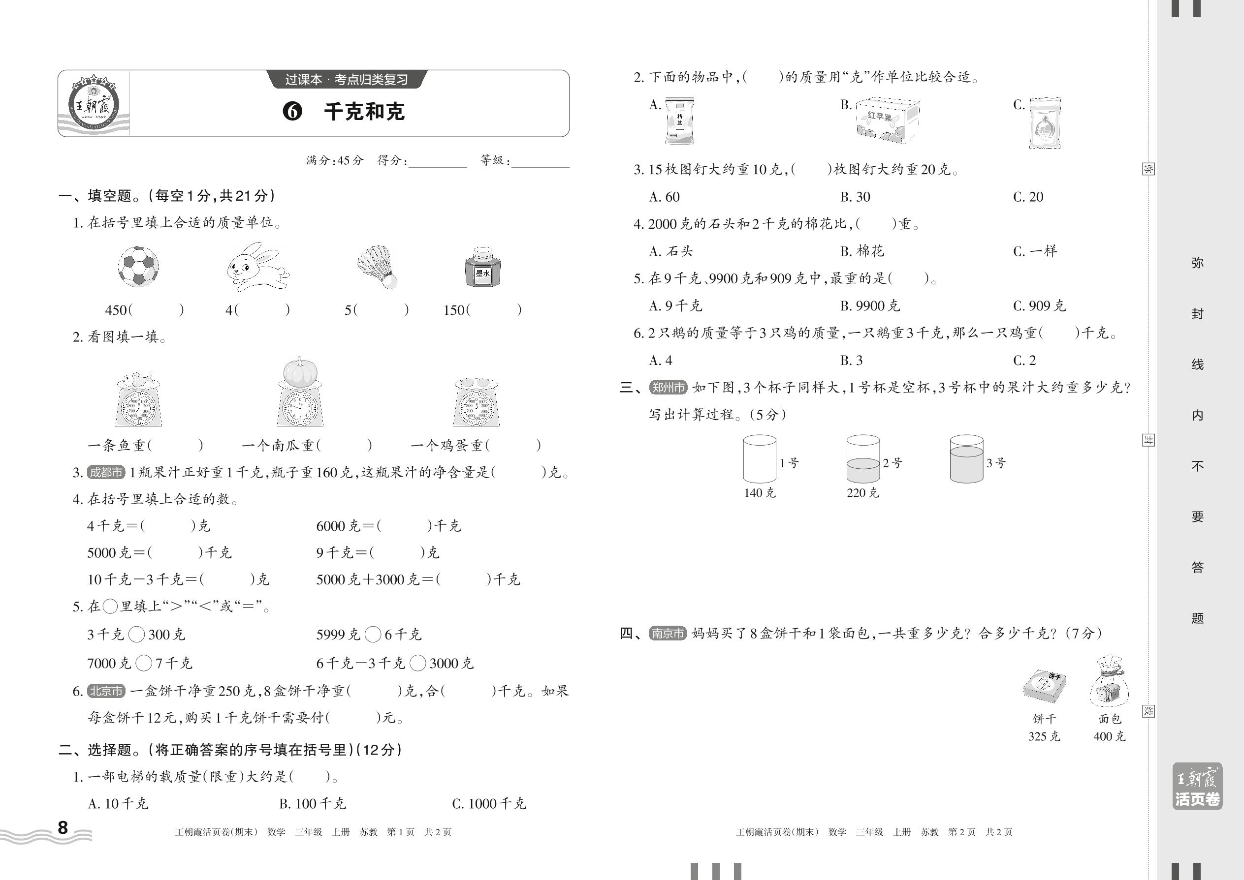 2023上册三年级数学苏教版 6 千克和克