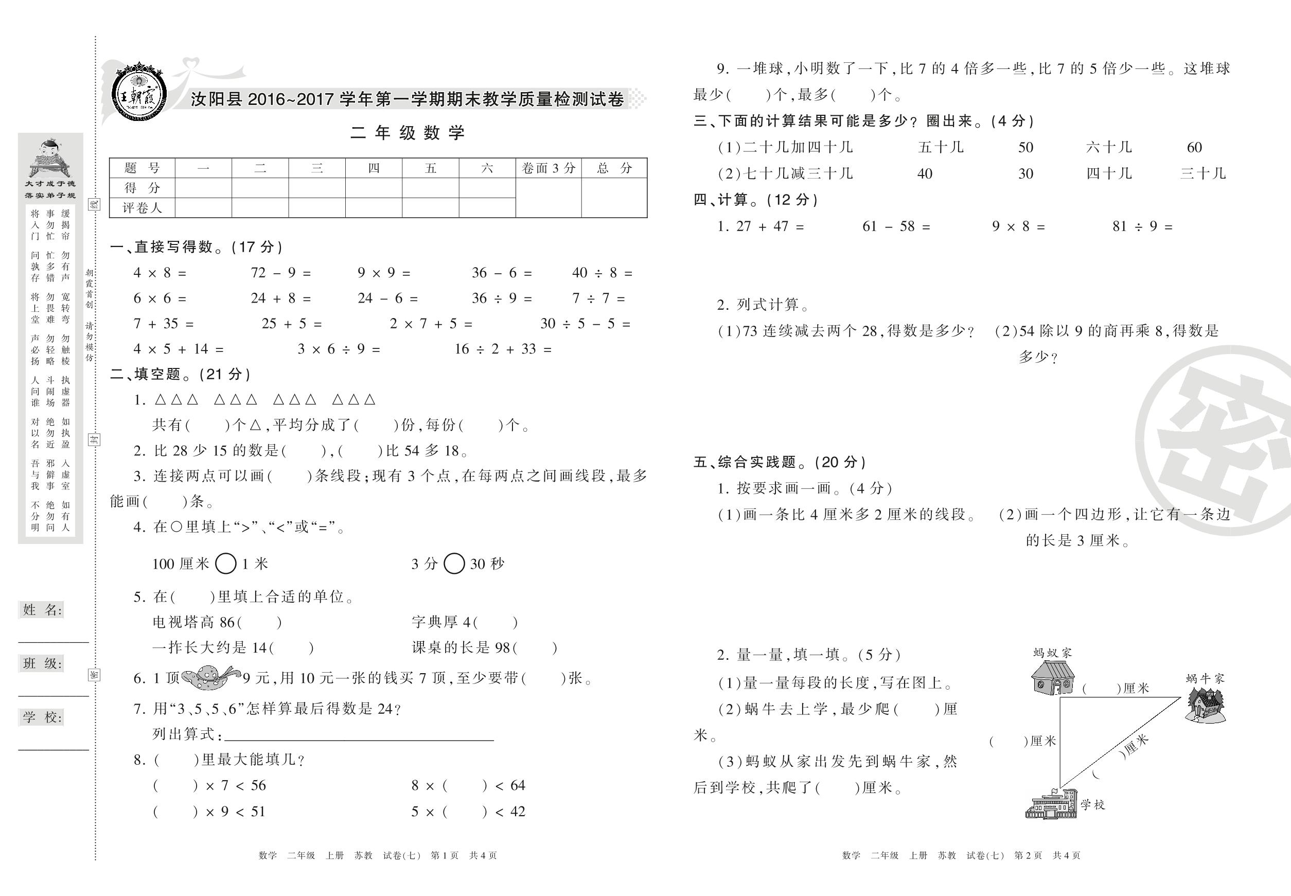 2016-2017学年第一学期洛阳市汝阳县二年级数学试卷(苏教版)【7】