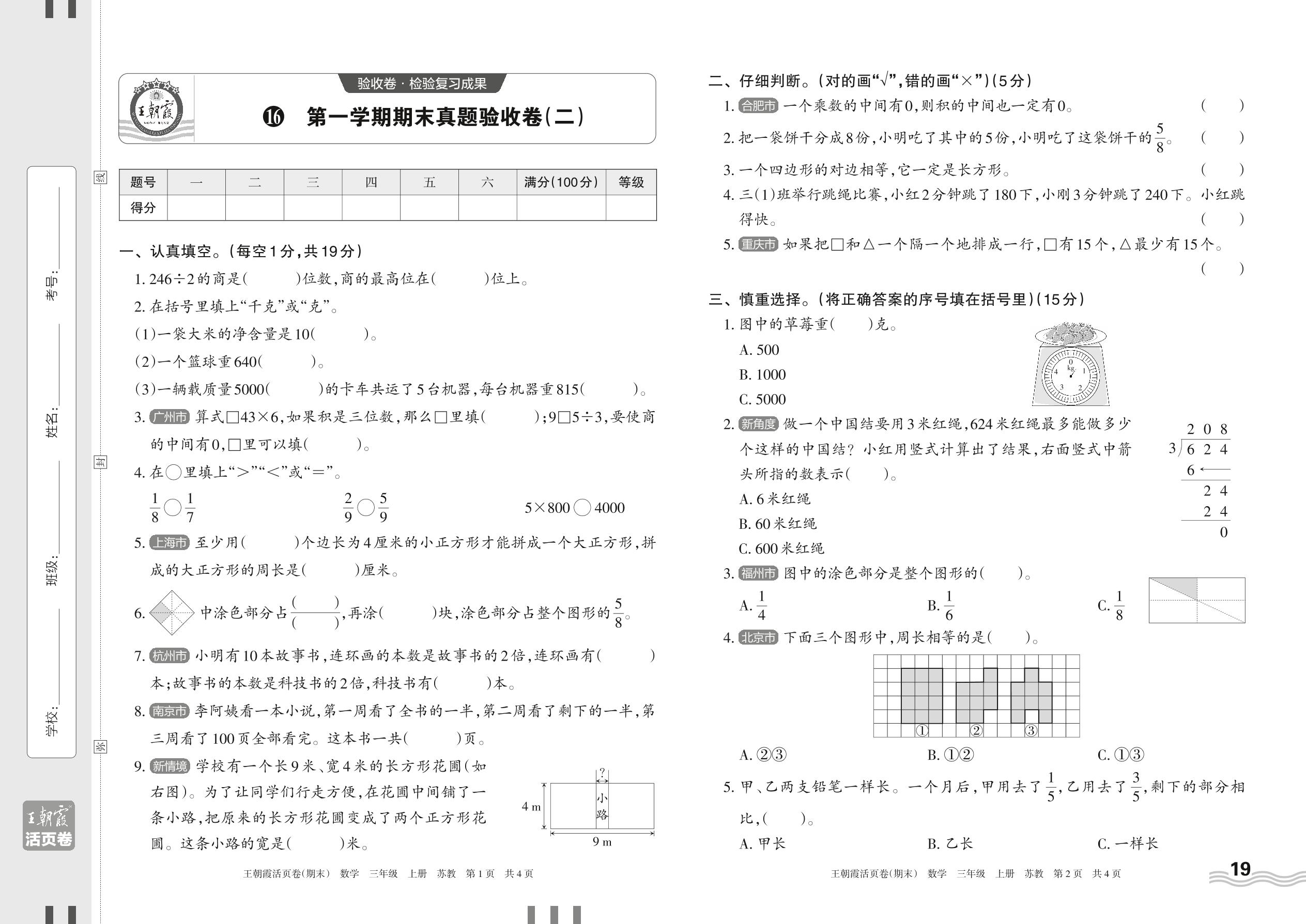 2023上册三年级数学苏教版 16 第一学期期末真题验收卷(二)