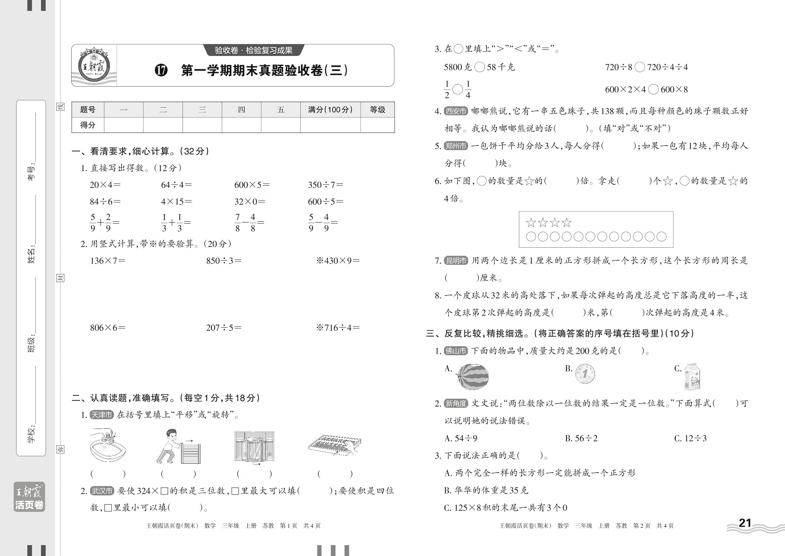 2023上册三年级数学苏教版 17 第一学期期末真题验收卷(三)