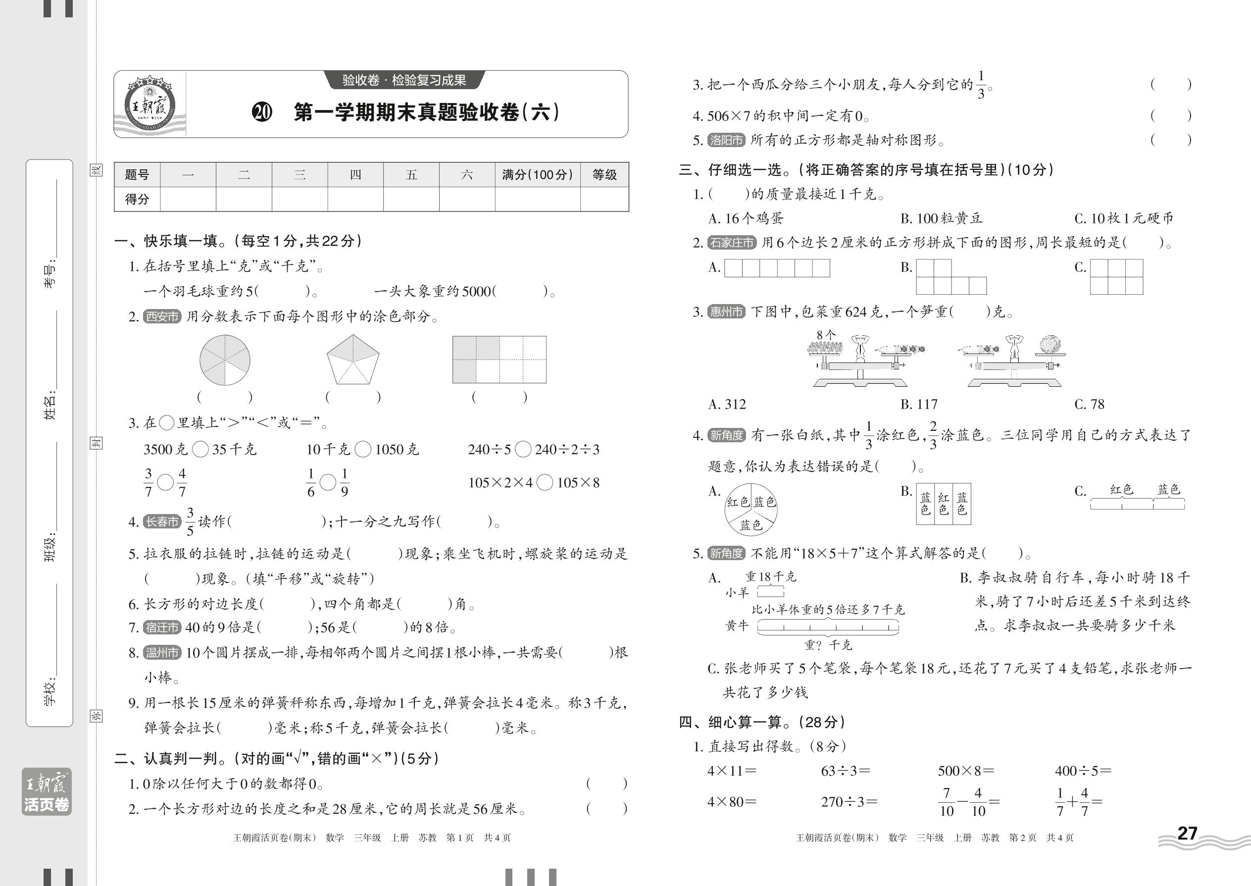 三年级数学苏教版上册期末卷