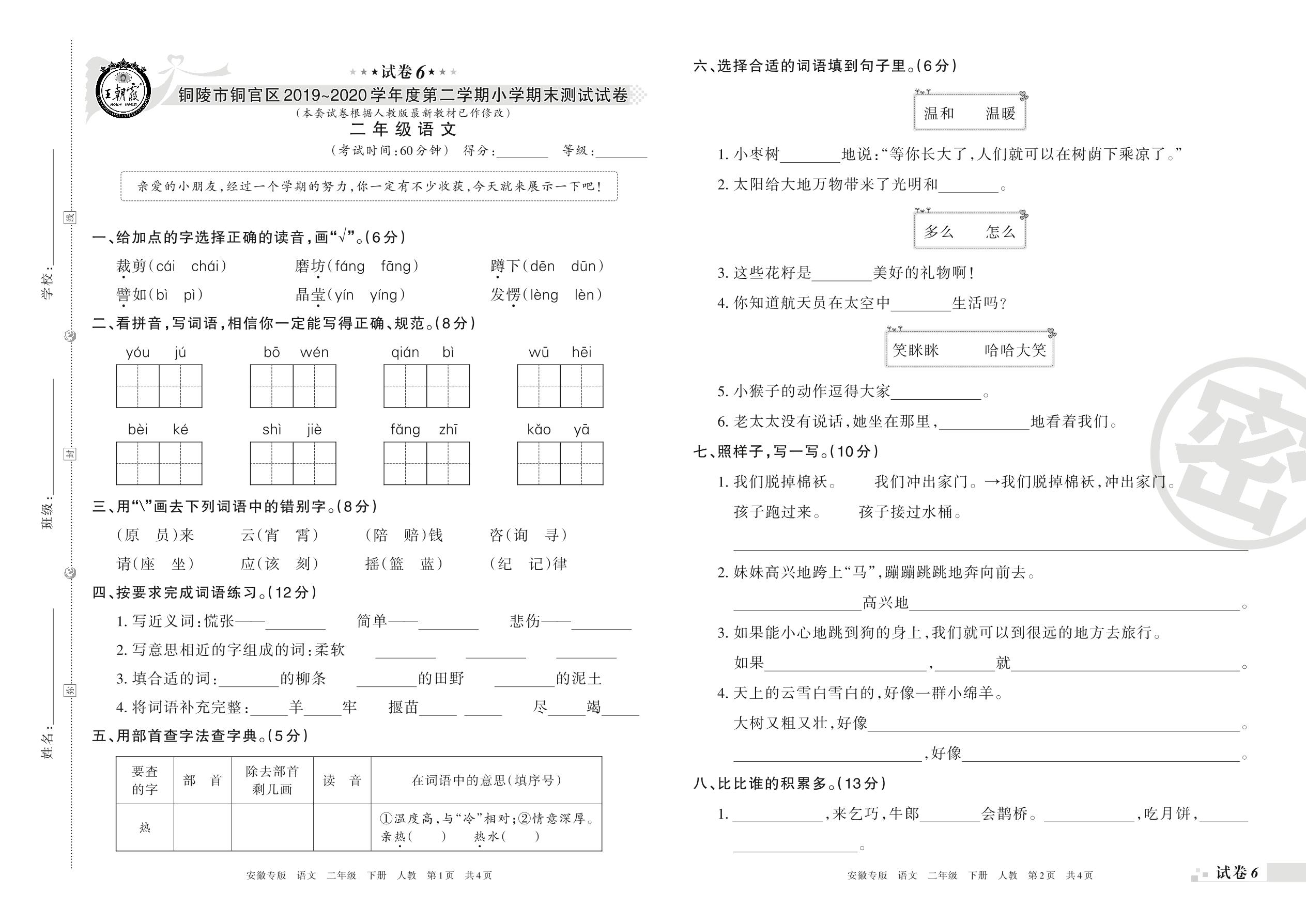 2019-2020学年第二学期铜陵市铜官区二年级语文试卷(人教版)【6】