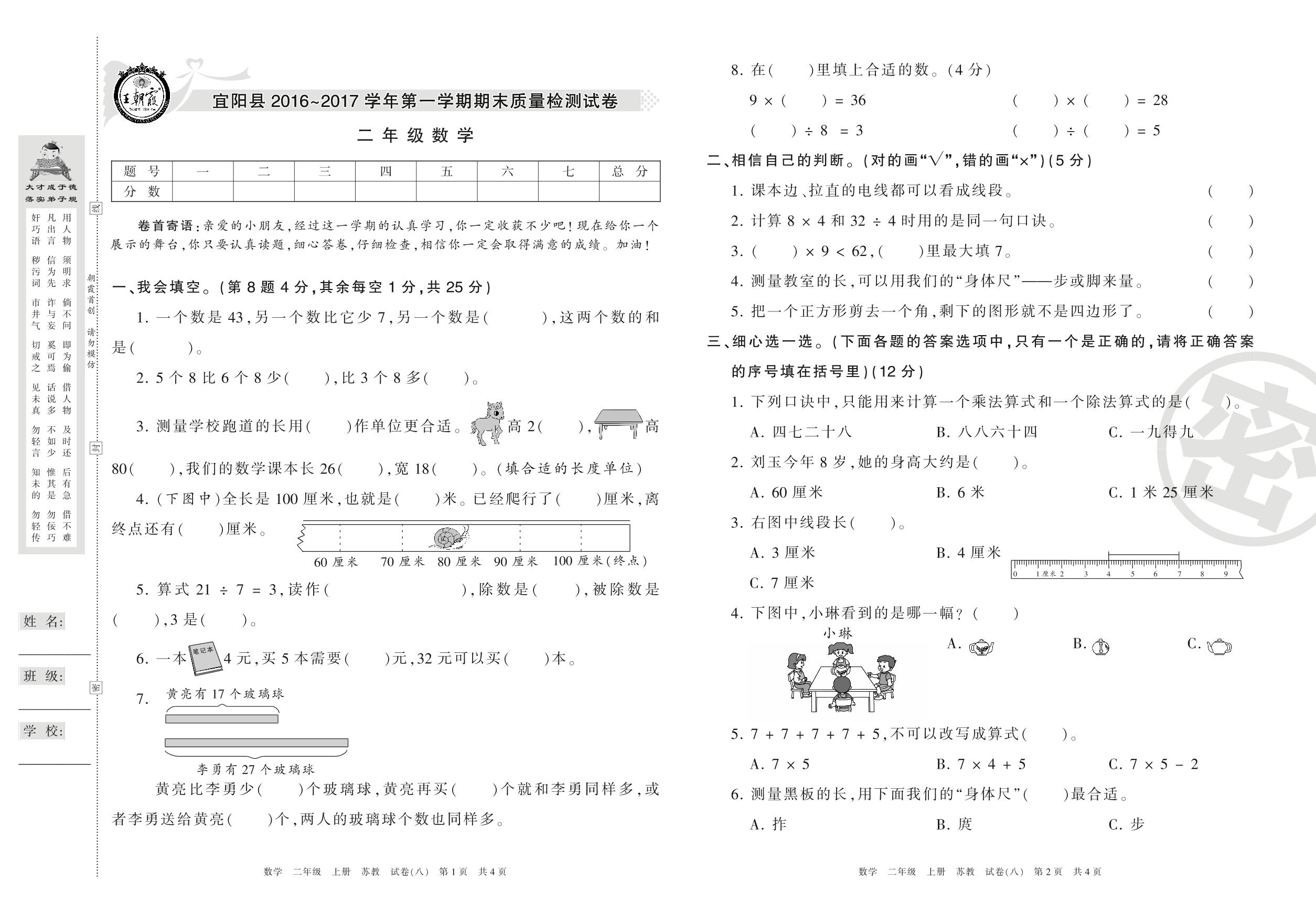 2016-2017学年第一学期洛阳市宜阳县二年级数学试卷(苏教版)【8】