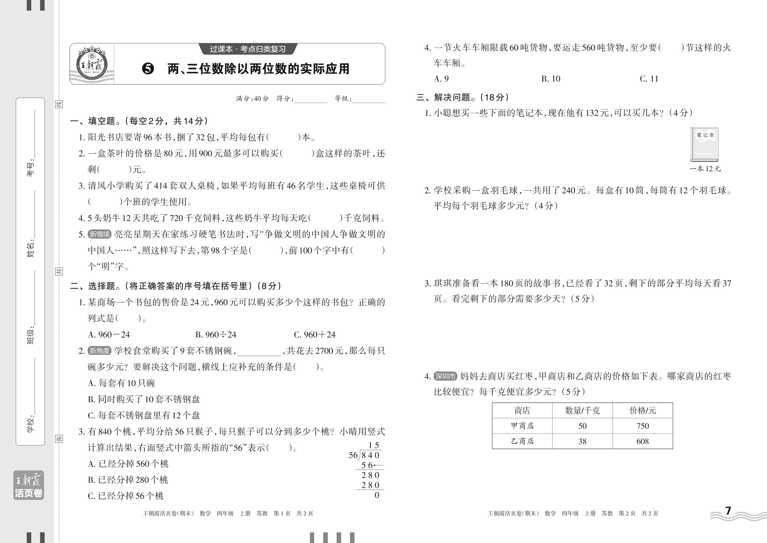 2023上册四年级数学苏教版 5 两、三位数除以两位数的实际应用