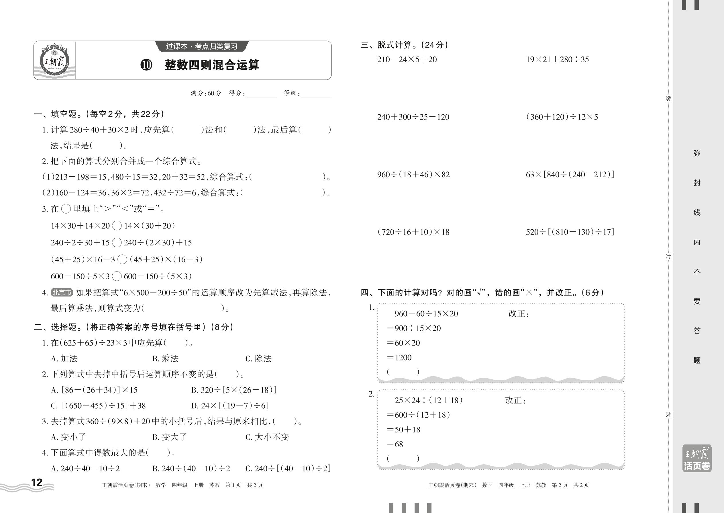 2023上册四年级数学苏教版 10 整数四则混合运算
