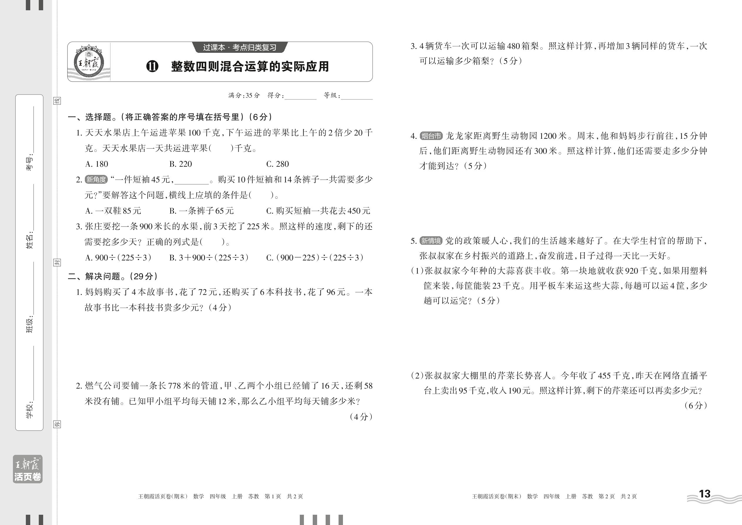 2023上册四年级数学苏教版 11 整数四则混合运算的实际应用