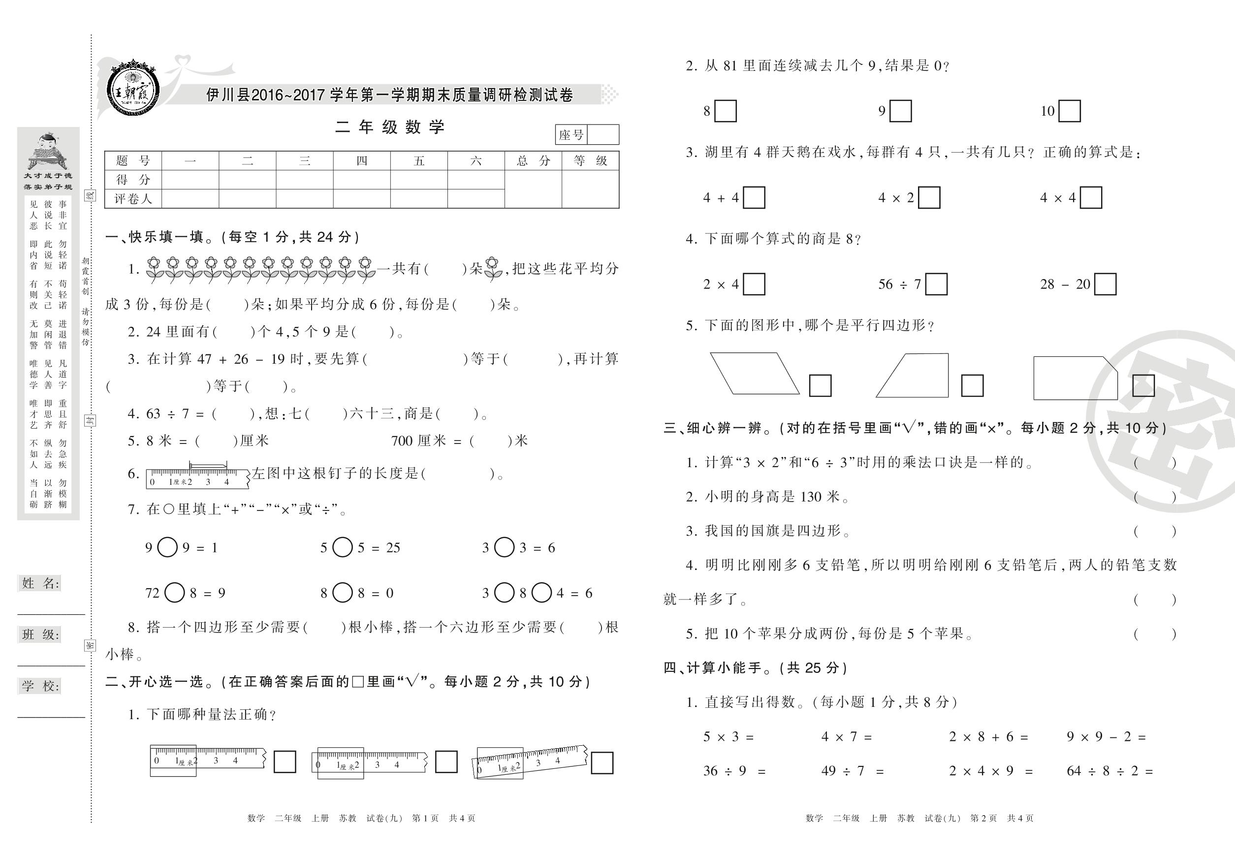 2016-2017学年第一学期洛阳市伊川县二年级数学试卷(苏教版)【9】