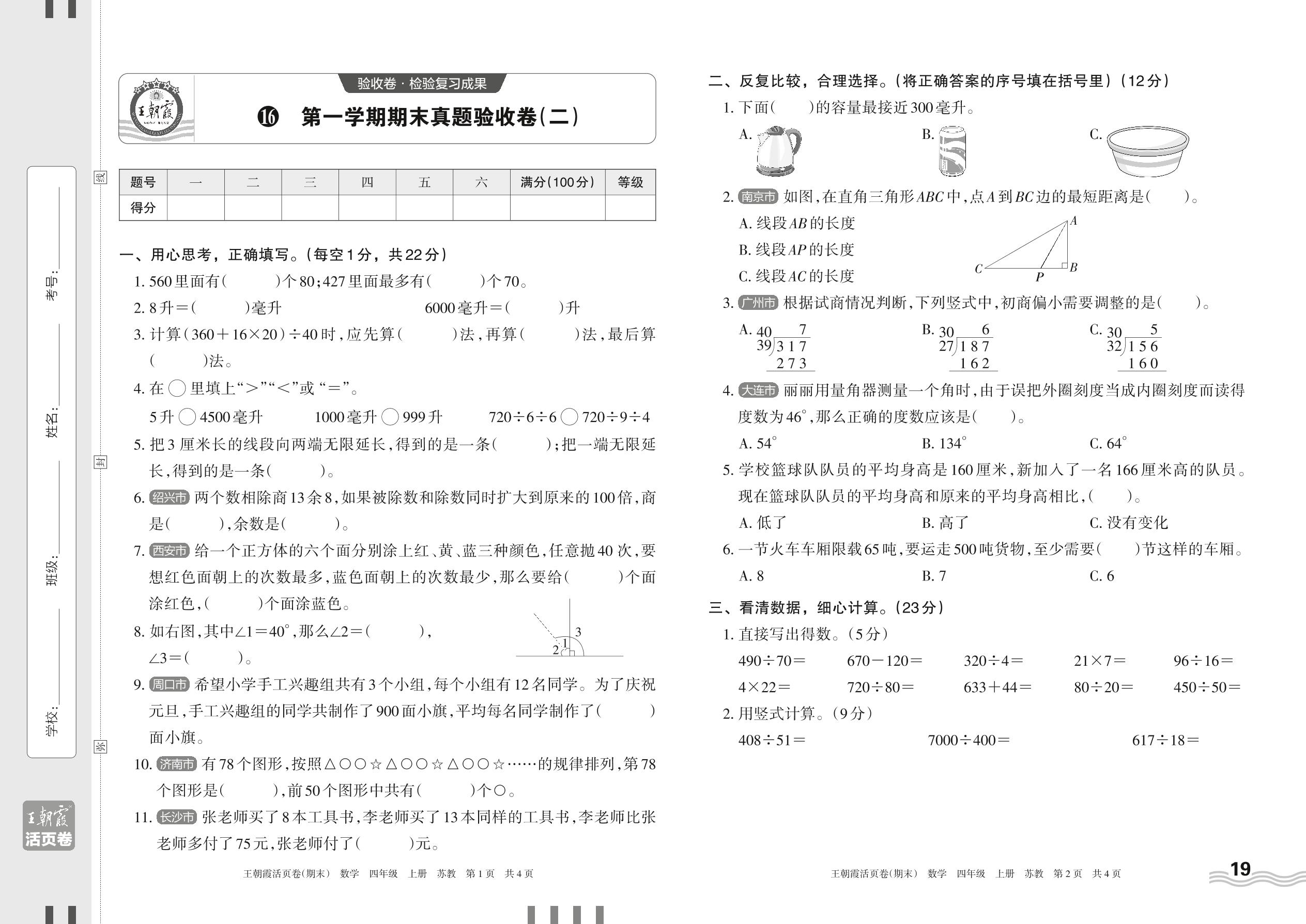 2023上册四年级数学苏教版 16 第一学期期末真题验收卷(二)