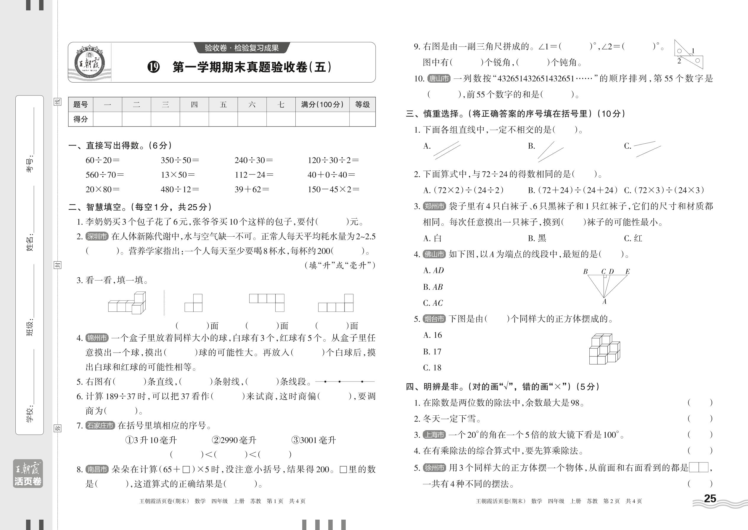 2023上册四年级数学苏教版 19 第一学期期末真题验收卷(五)