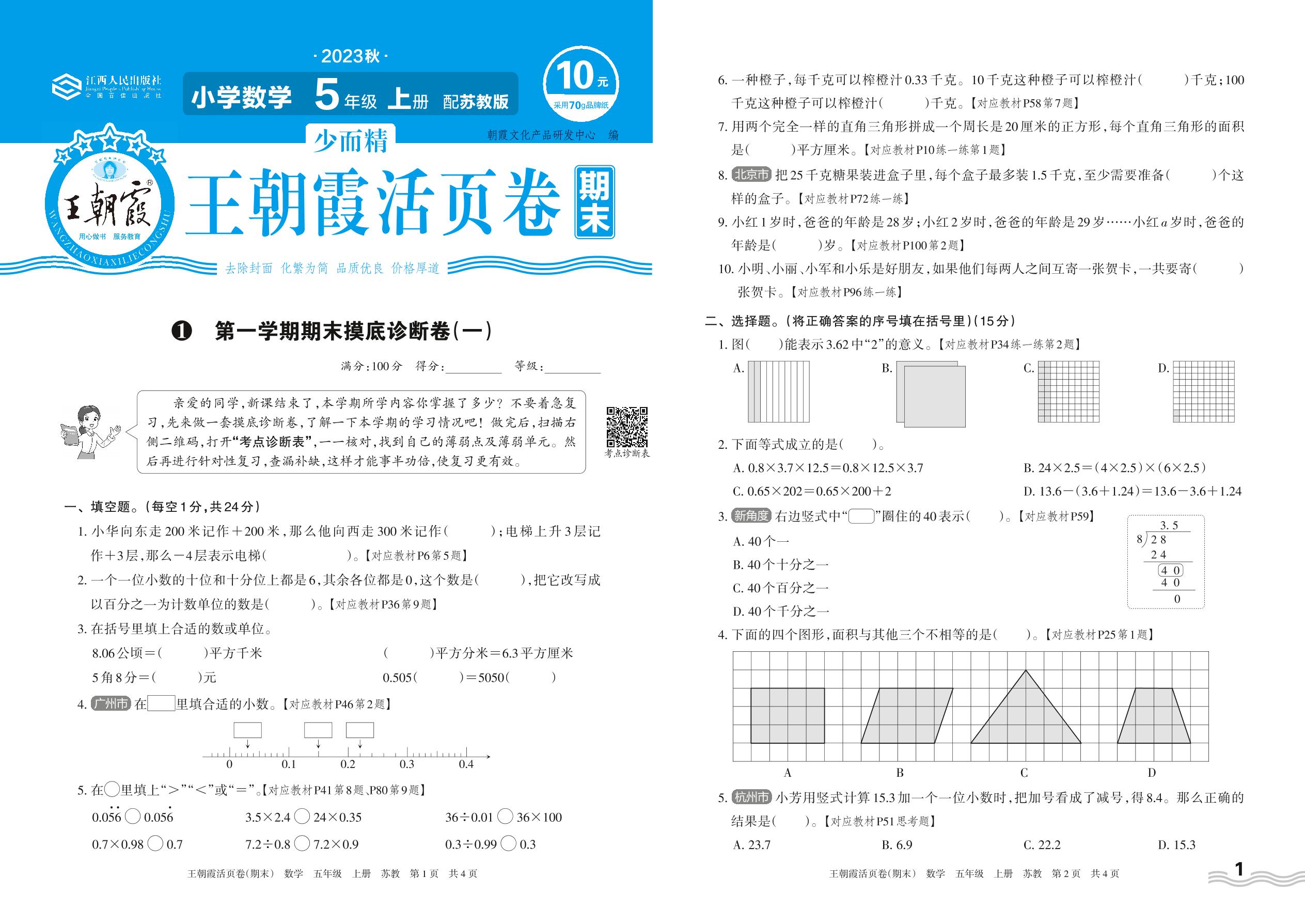 2023上册五年级数学苏教版 1 第一学期期末摸底诊断卷(一)