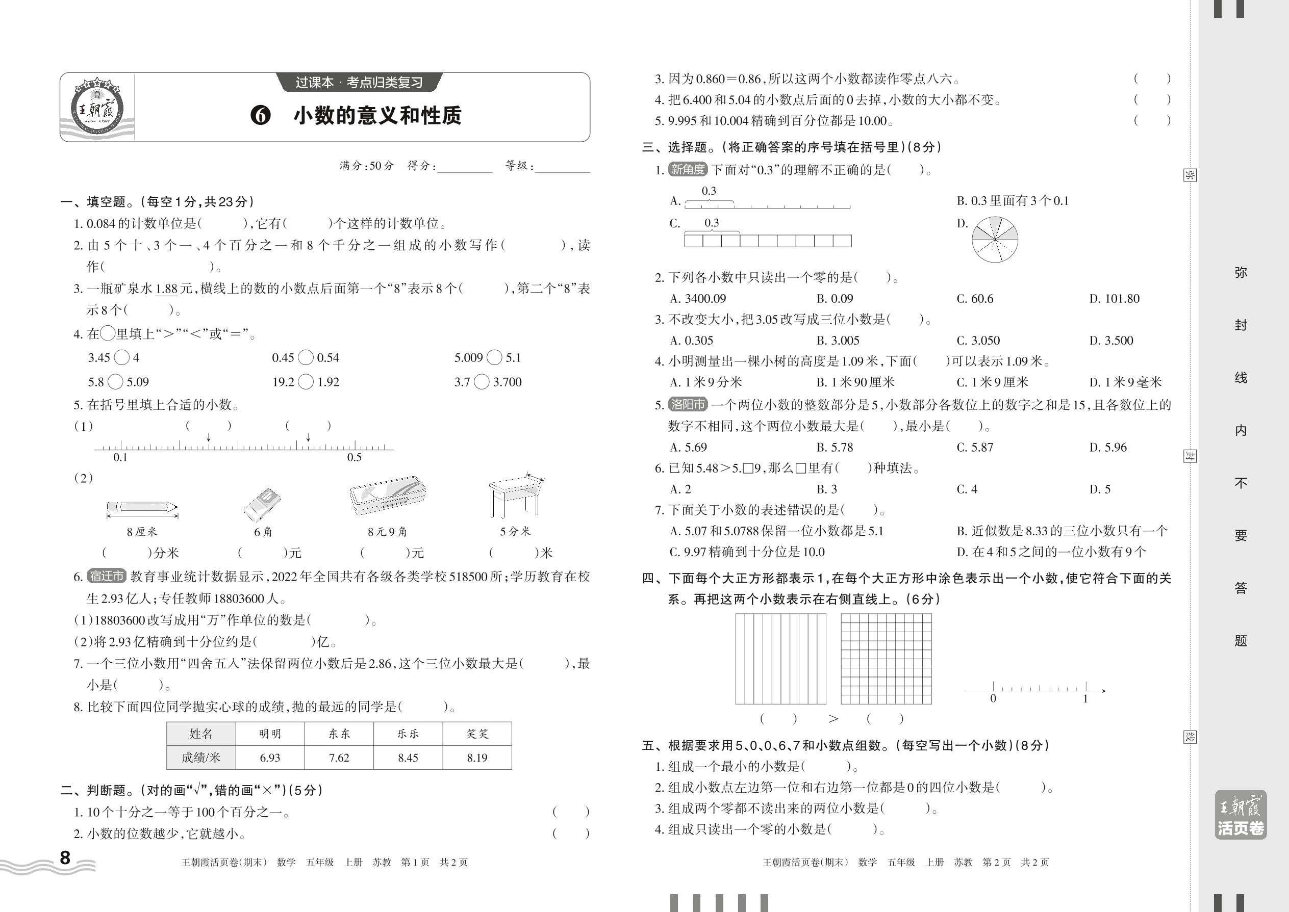 2023上册五年级数学苏教版 6 小数的意义和性质