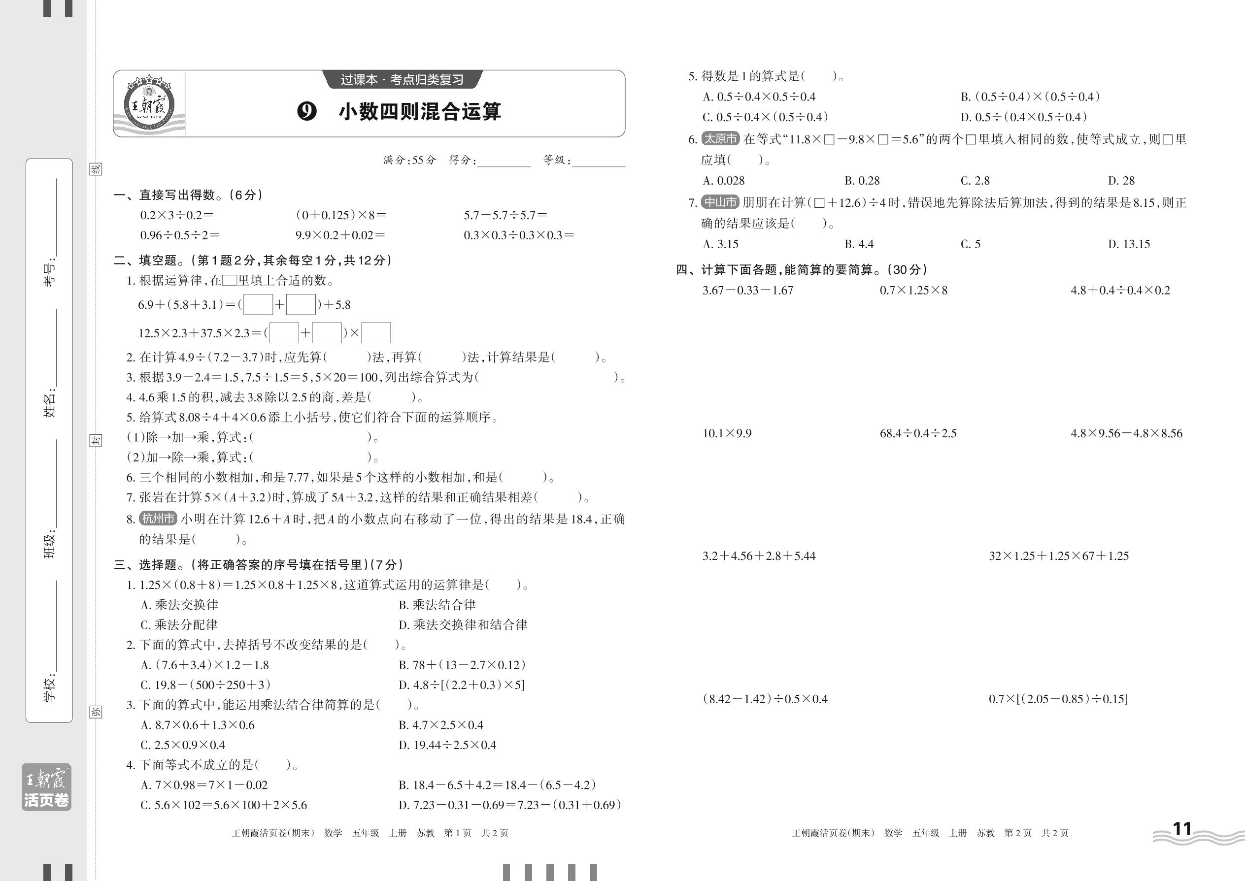 2023上册五年级数学苏教版 9 小数四则混合运算
