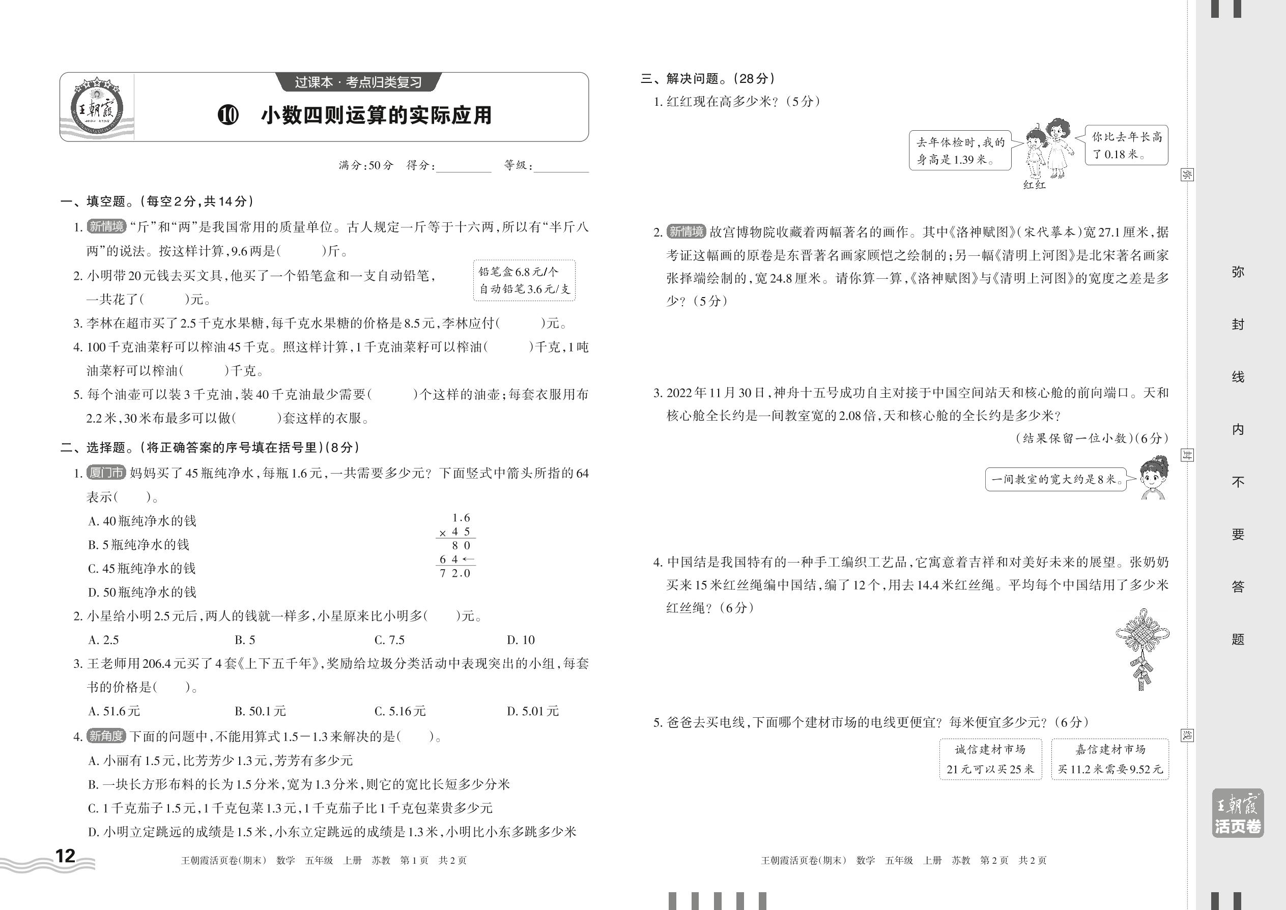 2023上册五年级数学苏教版 10 小数四则运算的实际应用
