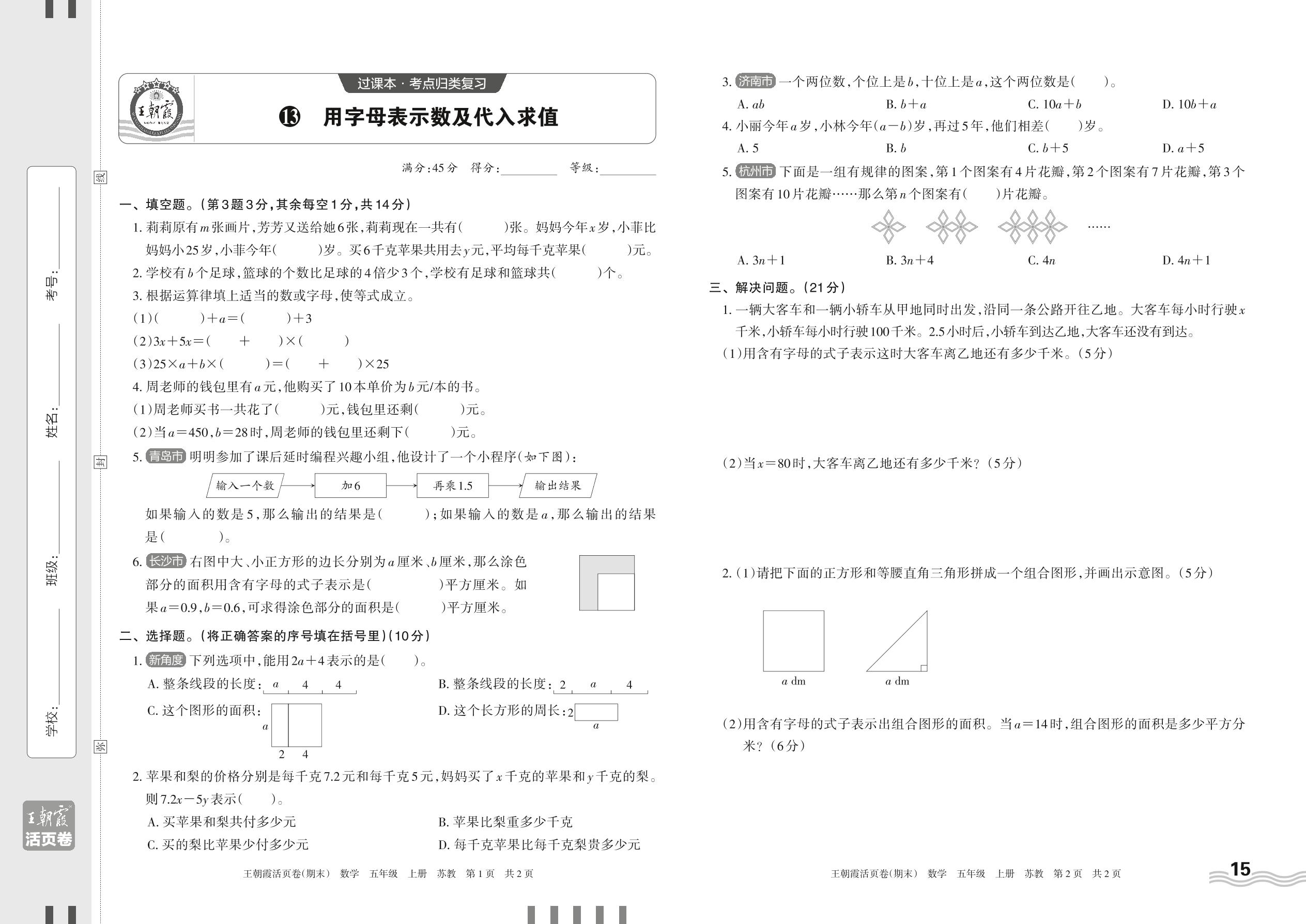 2023上册五年级数学苏教版 13 用字母表示数及代入求值