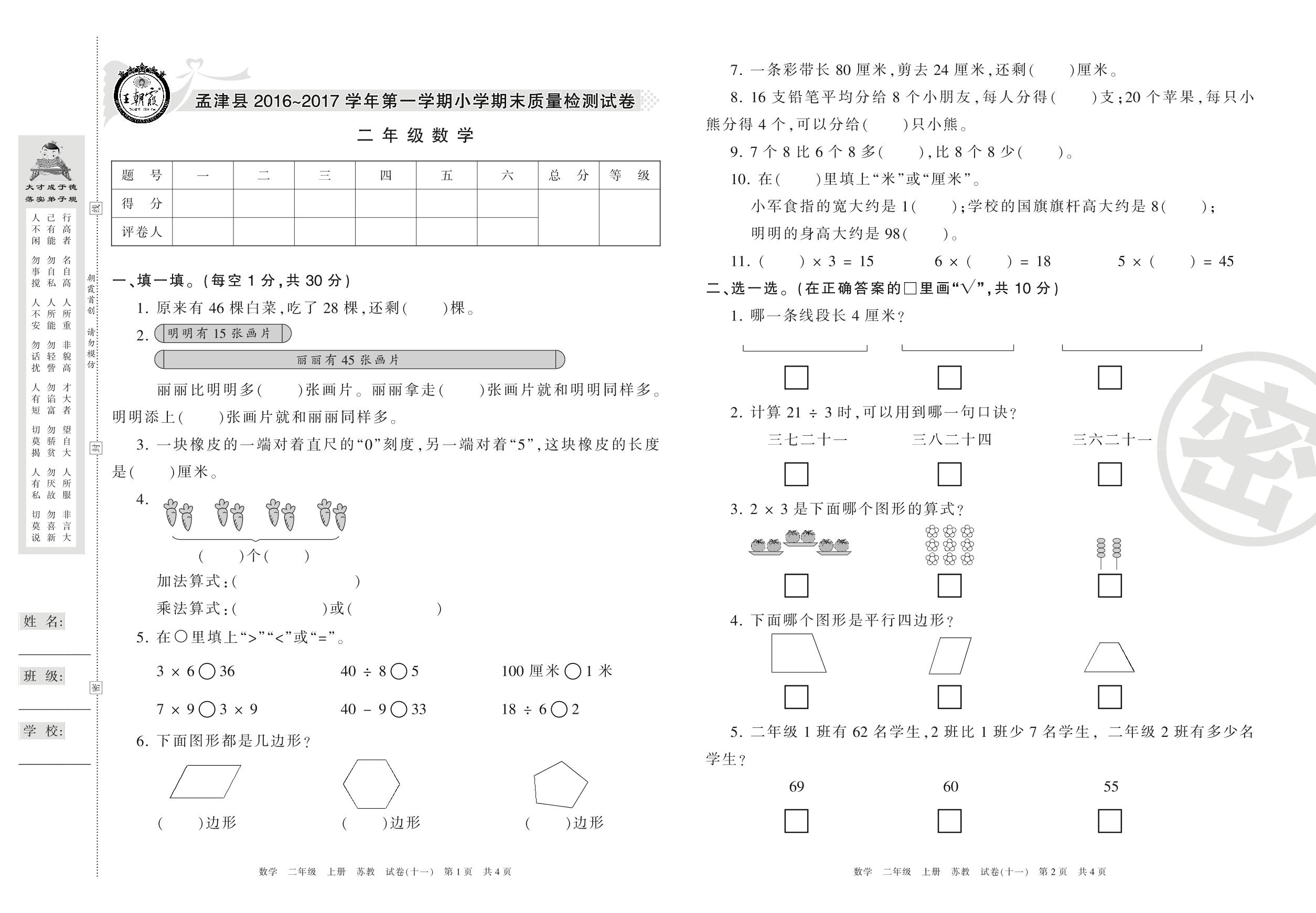 2016-2017学年第一学期洛阳市孟津县二年级数学试卷(苏教版)【11】