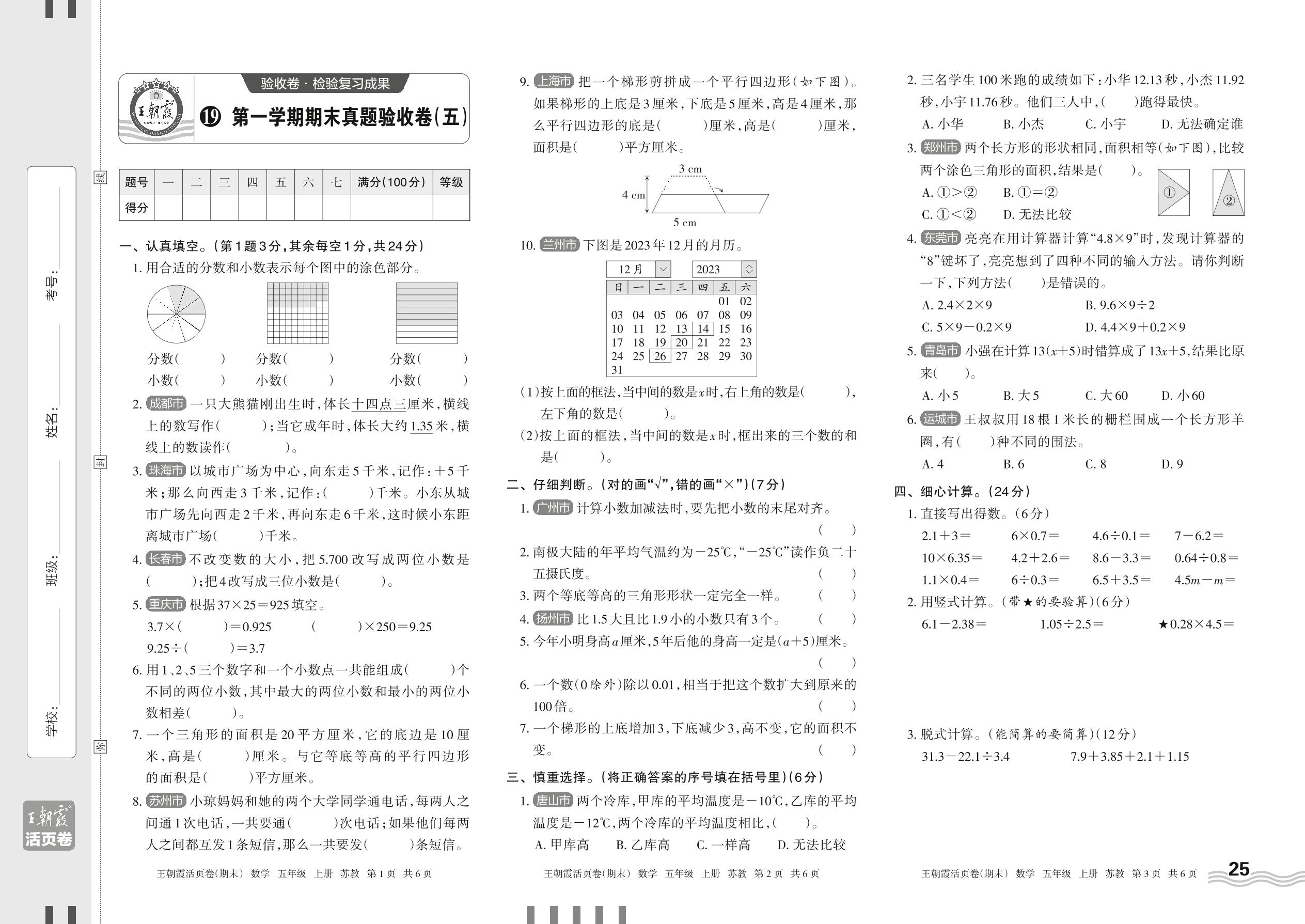 2023上册五年级数学苏教版 19 第一学期期末真题验收卷(五)