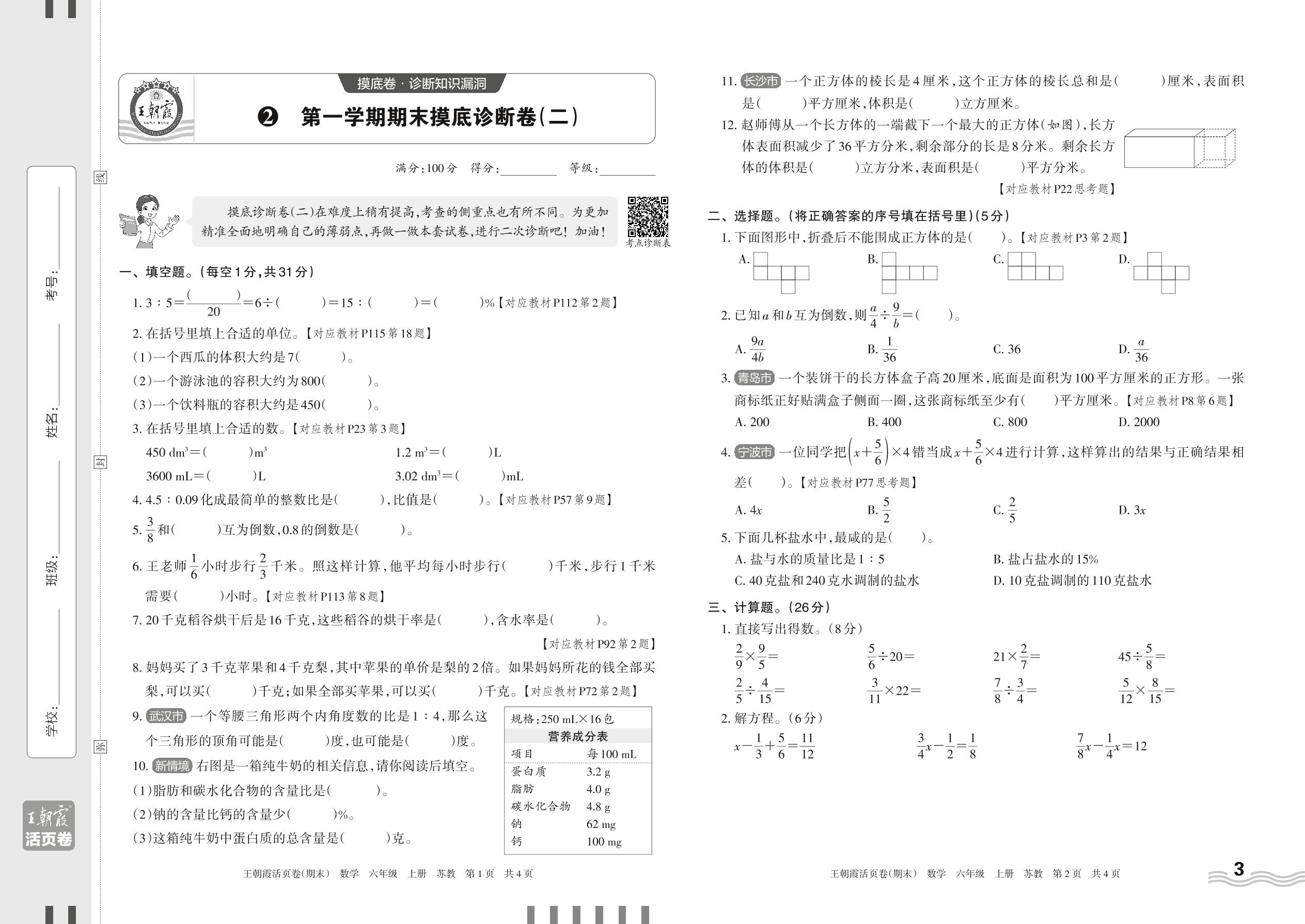 2023上册六年级数学苏教版 2 第一学期期末摸底诊断卷(二)