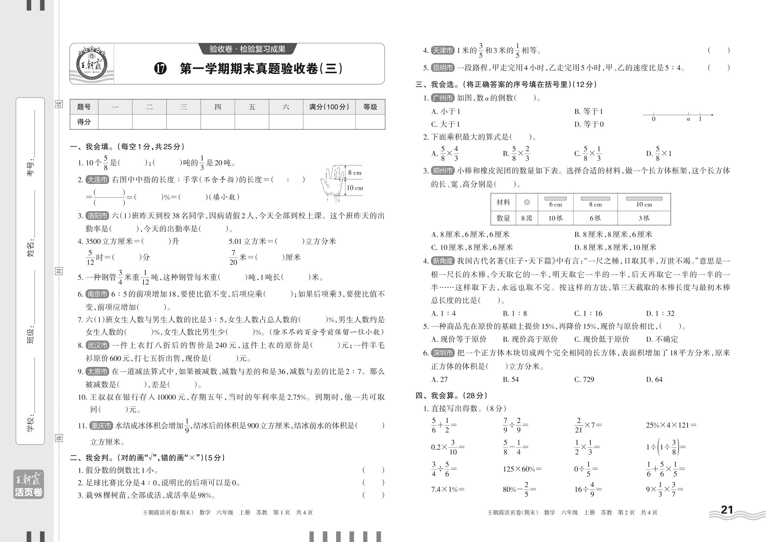 2023上册六年级数学苏教版 17 第一学期期末真题验收卷(三)